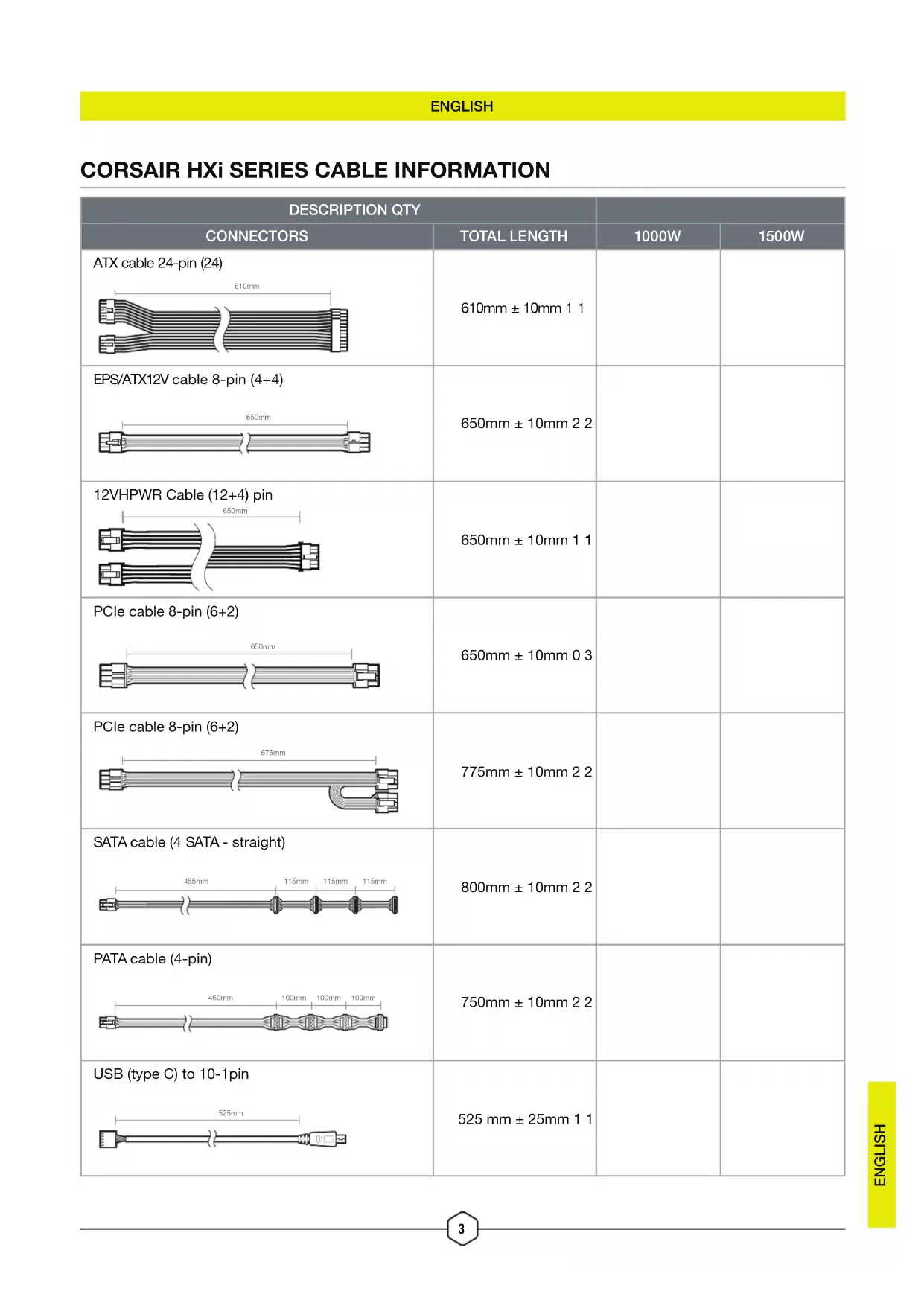 ATX cable 24-pin (24) 610mm ± 10mm 1 1 EPS/ATX12V cable 8-pin (4+4) 650mm ± 10mm 2 2 12VHPWR Cable (12+4) pin 650mm ± 10mm 1 1 PCIe cable 8-pin (6+2) 650mm ± 10mm 0 3 PCIe cable 8-pin (6+2) 775mm ± 10mm 2 2 SATA cable (4 SATA - straight) 800mm ± 10mm 2 2 PATA cable (4-pin) 750mm ± 10mm 2 2 USB (type C) to 10-1pin 525 mm ± 25mm 1 1 CORSAIR HXi SERIES CABLE INFORMATION ENGLISH 610mm610mm 650mm650mm 650mm650mm 675mm675mm 525mm525mm 650mm650mm 450mm450mm 455mm455mm 115mm115mm 115mm115mm 115mm115mm 100mm100mm 100mm100mm 100mm100mm4 ENGLISH