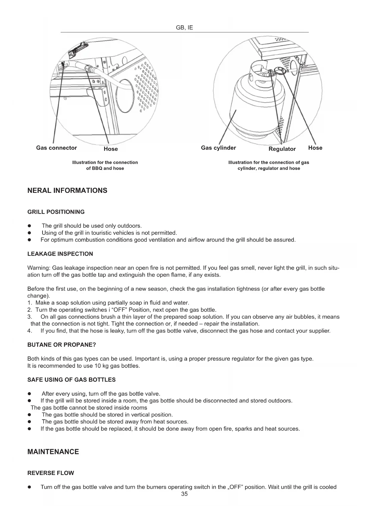 l After every using, turn off the gas bottle valve. l If the grill will be stored inside a room, the gas bottle should be disconnected and stored outdoors. The gas bottle cannot be stored inside rooms l The gas bottle should be stored in vertical position. l The gas bottle should be stored away from heat sources. l If the gas bottle should be replaced, it should be done away from open re, sparks and heat sources. MAINTENANCE REVERSE FLOW l Turn off the gas bottle valve and turn the burners operating switch in the „OFF” position. Wait until the grill is cooled Gas connector Gas cylinder Regulator Hose Hose Illustration for the connection of BBQ and hose Illustration for the connection of gas cylinder, regulator and hoseGB, IE
