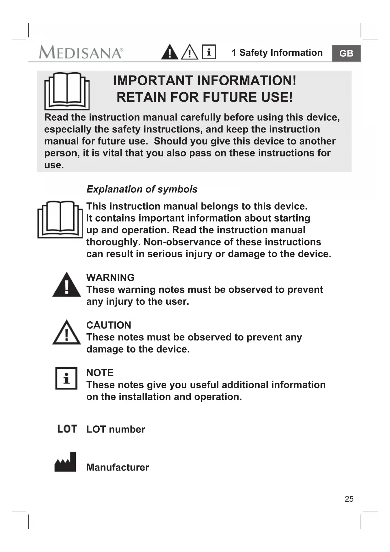 1 Safety Information IMPORTANT INFORMATION! RETAIN FOR FUTURE USE! Read the instruction manual carefully before using this device, especially the safety instructions, and keep the instruction manual for future use. Should you give this device to another person, it is vital that you also pass on these instructions for use. Explanation of symbols This instruction manual belongs to this device. It contains important information about starting up and operation. Read the instruction manual thoroughly. Non-observance of these instructions can result in serious injury or damage to the device. WARNING These warning notes must be observed to prevent any injury to the user. CAUTION These notes must be observed to prevent any damage to the device. NOTE These notes give you useful additional information on the installation and operation. LOT number Manufacturer26 1 Safety Information