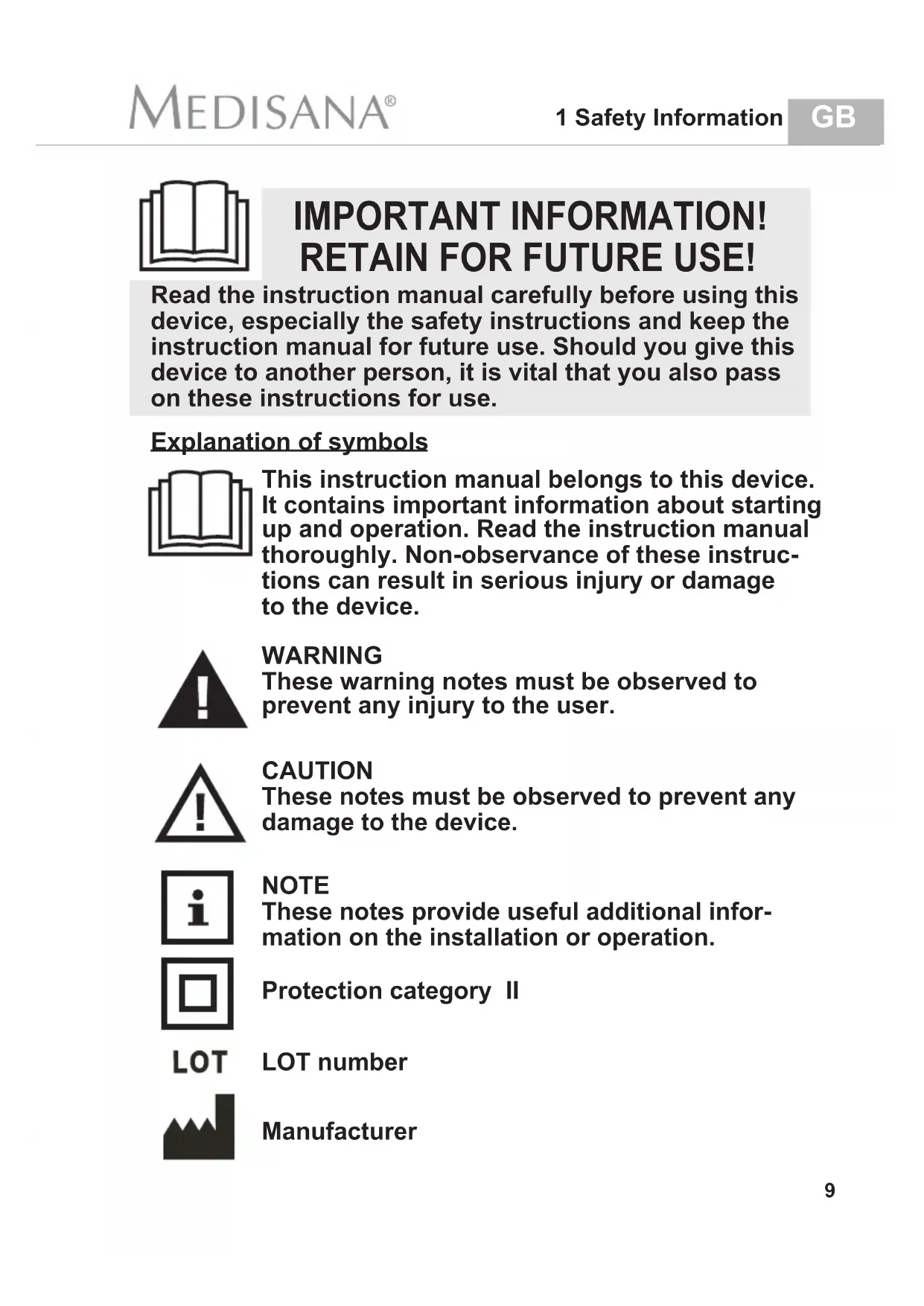 5 Garantie Die Service-Adresse finden Sie auf dem separaten Beilegeblatt.9 IMPORTANT INFORMATION! RETAIN FOR FUTURE USE! This instruction manual belongs to this device. It contains important information about starting up and operation. Read the instruction manual thoroughly. Non-observance of these instruc- tions can result in serious injury or damage to the device. WARNING These warning notes must be observed to prevent any injury to the user. CAUTION These notes must be observed to prevent any damage to the device. NOTE These notes provide useful additional infor- mation on the installation or operation. Protection category II Explanation of symbols LOT number Manufacturer Read the instruction manual carefully before using this device, especially the safety instructions and keep the instruction manual for future use. Should you give this device to another person, it is vital that you also pass on these instructions for use.
