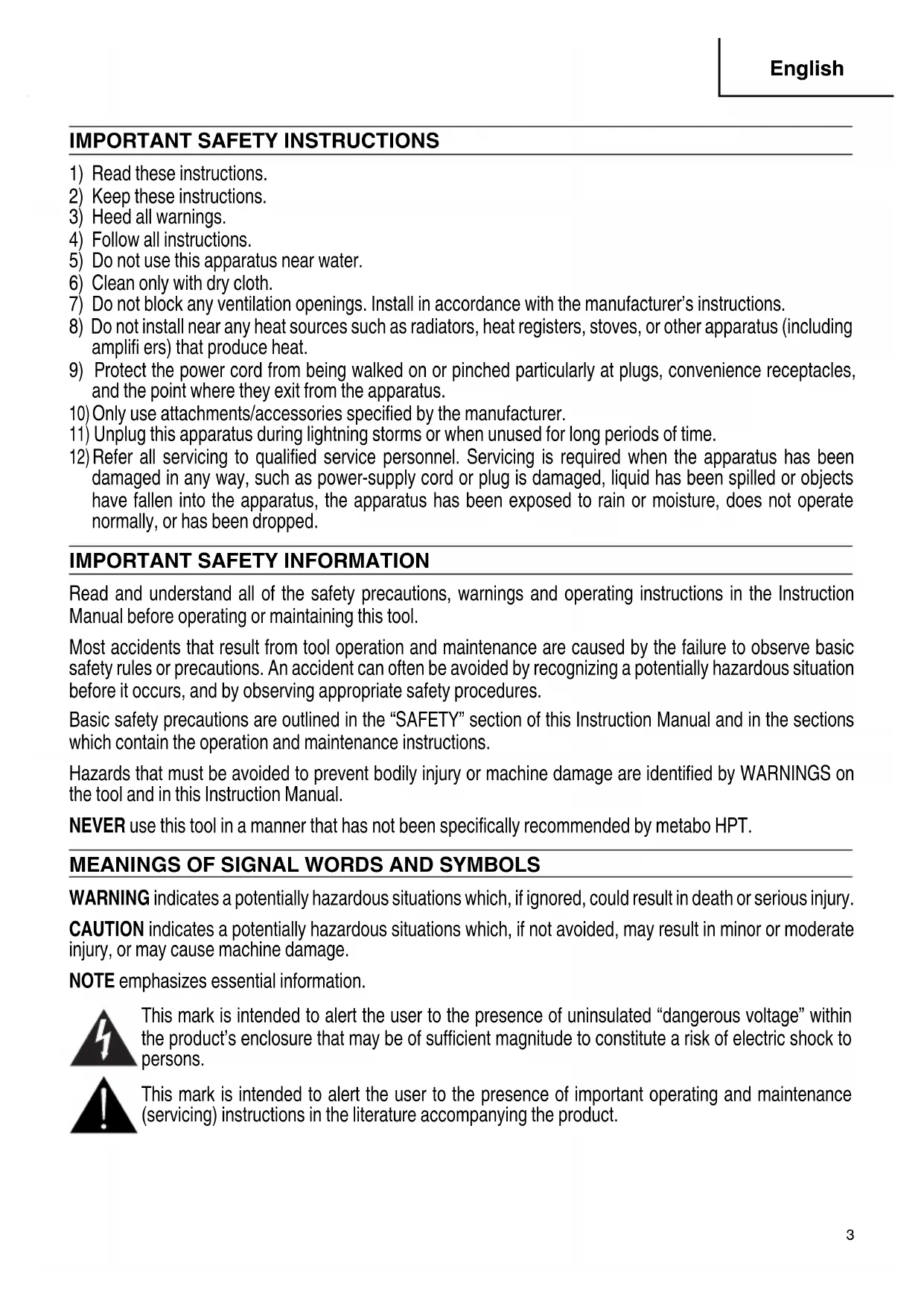Read and understand all of the safety precautions, warnings and operating instructions in the Instruction Manual before operating or maintaining this tool. Most accidents that result from tool operation and maintenance are caused by the failure to observe basic safety rules or precautions. An accident can often be avoided by recognizing a potentially hazardous situation before it occurs, and by observing appropriate safety procedures. Basic safety precautions are outlined in the “SAFETY” section of this Instruction Manual and in the sections which contain the operation and maintenance instructions. Hazards that must be avoided to prevent bodily injury or machine damage are identifi ed by WARNINGS on the tool and in this Instruction Manual. NEVER use this tool in a manner that has not been specifi cally recommended by metabo HPT.