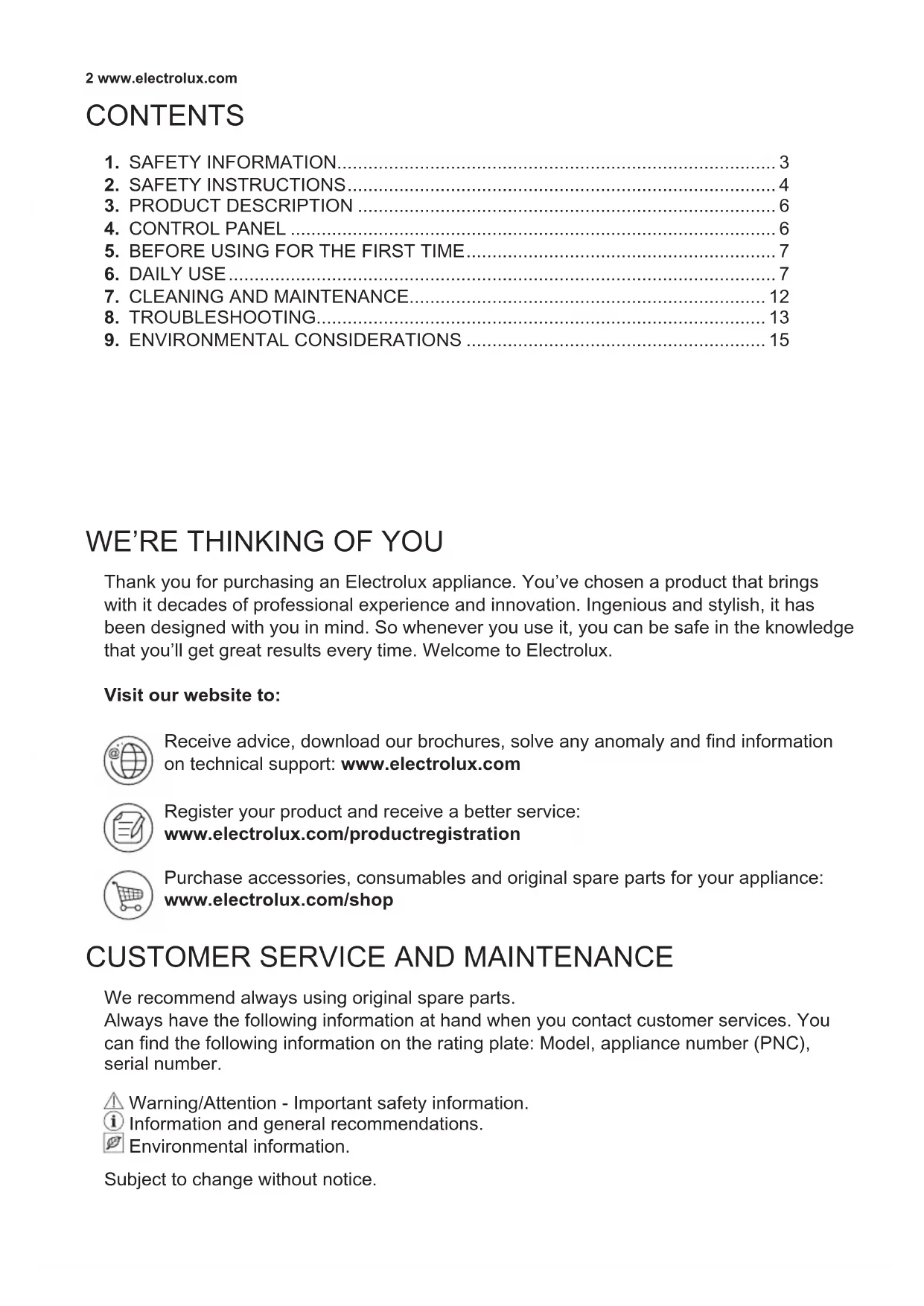 Thank you for purchasing an Electrolux appliance. You've chosen a product that brings with it decades of professional experience and innovation. Ingenious and stylish, it has been designed with you in mind. So whenever you use it, you can be safe in the knowledge that you'll get great results every time. Welcome to Electrolux.