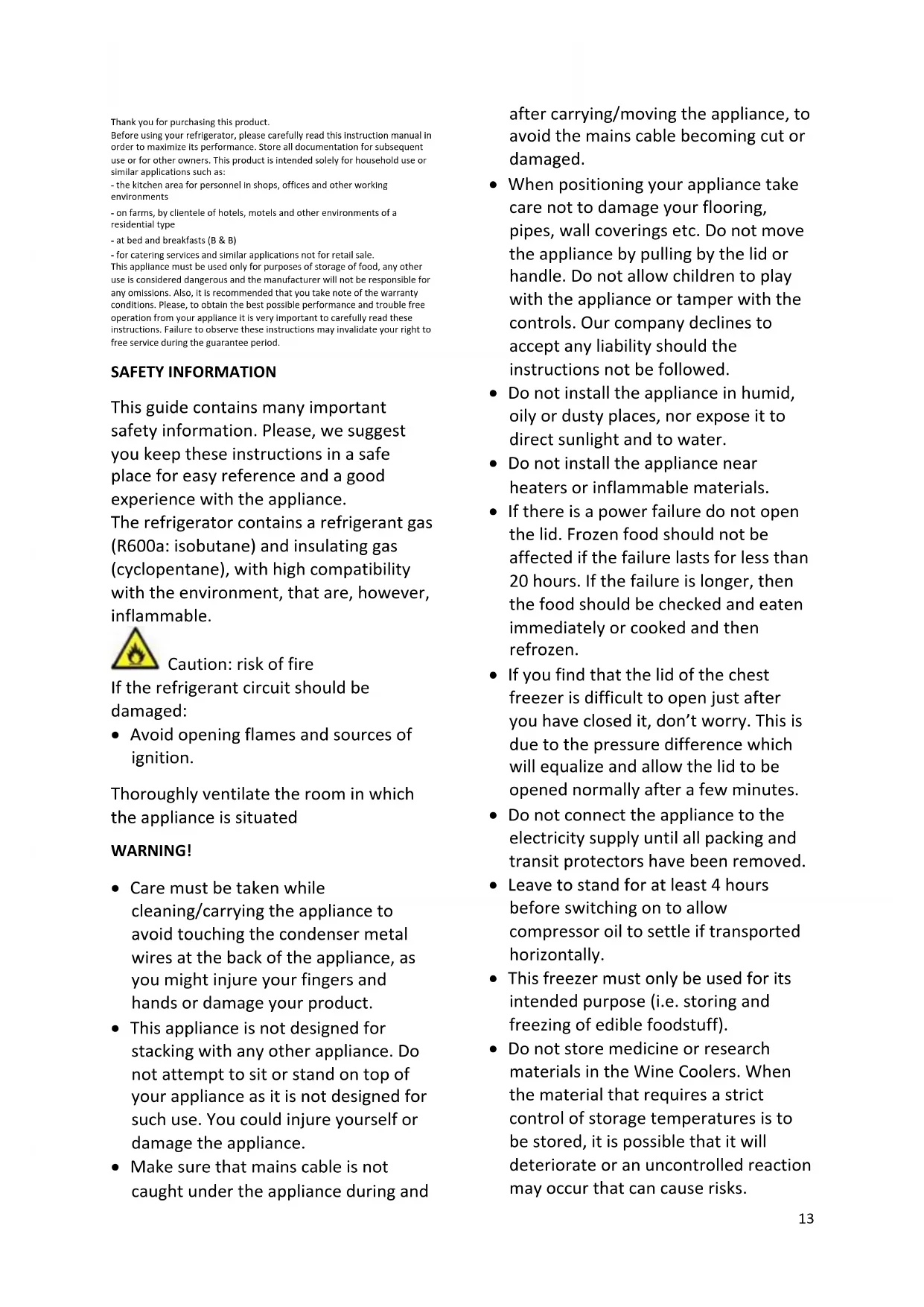 - Do not dispose of the appliance on a fire. Take care not to damage, the cooling circuit/pipes of the appliance in transportation and in use. In case of damage do not expose the appliance to fire, potential ignition source and immediately ventilate the room where the appliance is situated.