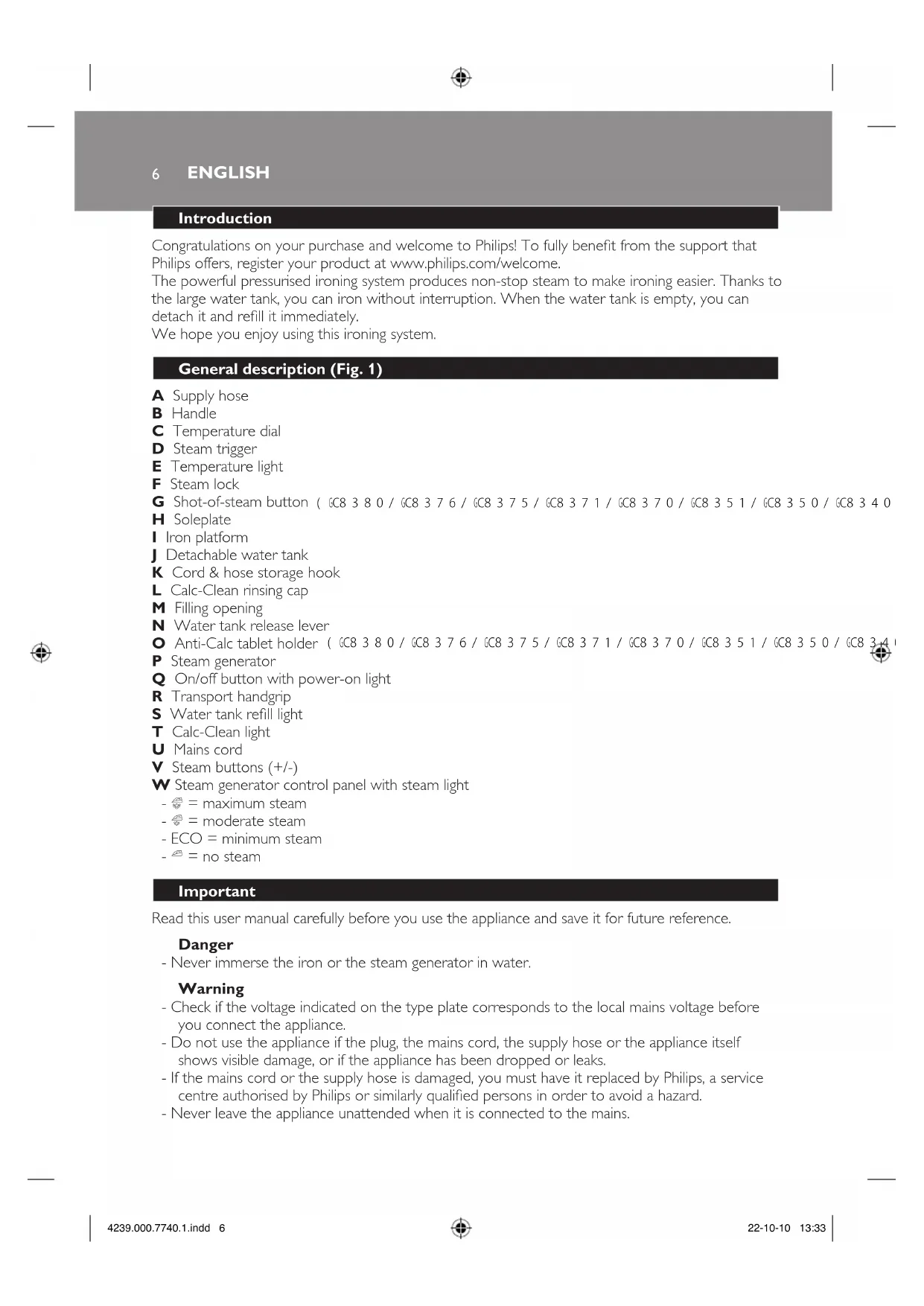 4239.000.7740.1.indd 6 22-10-10 13:33 (GC8380/GC8376/GC8375/GC8371/GC8370/GC8351/GC8350/GC8340/GC8330only) (GC8380/GC8376/GC8375/GC8371/GC8370/GC8351/GC8350/GC8340only)- This appliance is not intended for use by persons (including children) with reduced physical, sensory or mental capabilities, or lack of experience and knowledge, unless they have been given supervision or instruction concerning use of the appliance by a person responsible for their safety. - Children should be supervised to ensure that they do not play with the appliance. - Do not let the mains cord and supply hose come into contact with the hot soleplate of the iron. - If steam escapes from under the Calc-Clean rinsing cap when the appliance heats up, switch off the appliance and tighten the Calc-Clean rinsing cap. If steam continues to escape when the appliance heats up, switch off the appliance and contact a service centre authorised by Philips. - Never remove the Calc-Clean rinsing cap when the steam generator is hot. - Do not use any other cap on the steam generator than the Calc-Clean rinsing cap that has been supplied with the appliance, as this cap also functions as a safety valve.