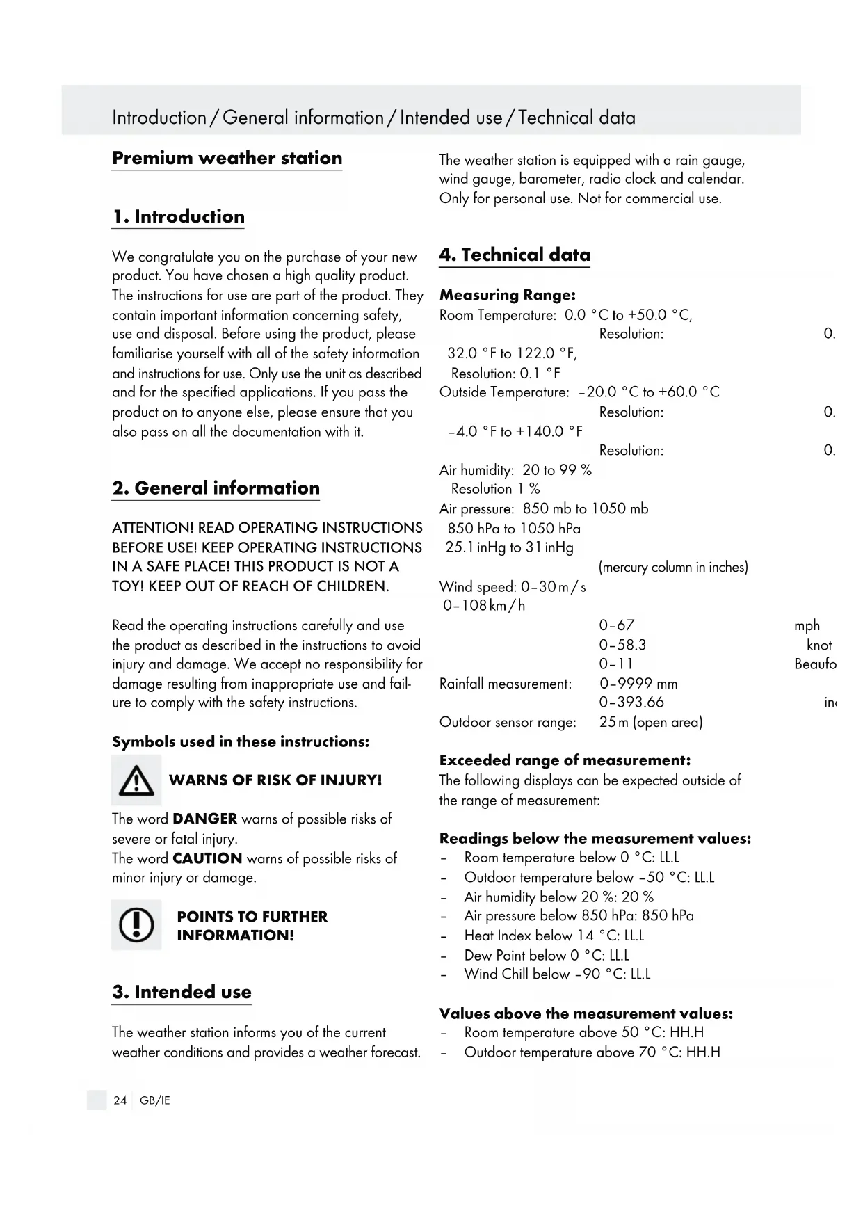 Weather station: – Radio-controlled DCF-77 time signal reception with time display, time-zone setting – Date display – Alarm clock with snooze function – Room temperature and interior humidity display with storage of the minimum and maximum measurement values – Outside temperature and outside humidity display with storage of the minimum and maximum measured values – Barometric pressure display – Weather trend display – Battery status display (weather station, wind gauge and rain gauge) – Wind direction display – Wind speed with wind alarm – Dew point display (Dew Point) – Ice/frost alert – Precipitation display – Wind speed and wind direction display – Wind chill display (Wind Chill) – Can be mounted standing or hanging – For indoor use only Wind gauge: – Transmits the wind speed, temperature and humid- ity to the weather station on 434 MHz frequency – Assembled on a mast of approx. ø 25–31 mm – Can only be assembled in areas free from buildings, walls or other obstructions, as the measurement values will otherwise be impaired. Rain gauge: – Transmits rainfall quantity to the weather station on 434 MHz frequency – Easy to stand or mount with screws on an even surface – It is best to stand or mount the rain gauge in an areas which are not protected from rain. CAUTION! Comply with the following safety instruc- tions when using the wind gauge and rain gauge: – Never immerse the measuring devices in water or other liquids – Never place the measuring devices in ovens or microwaves – Never expose the measuring devices to temper- atures below –20 °C or above 60 °C – Keep the measuring device away from chemicals