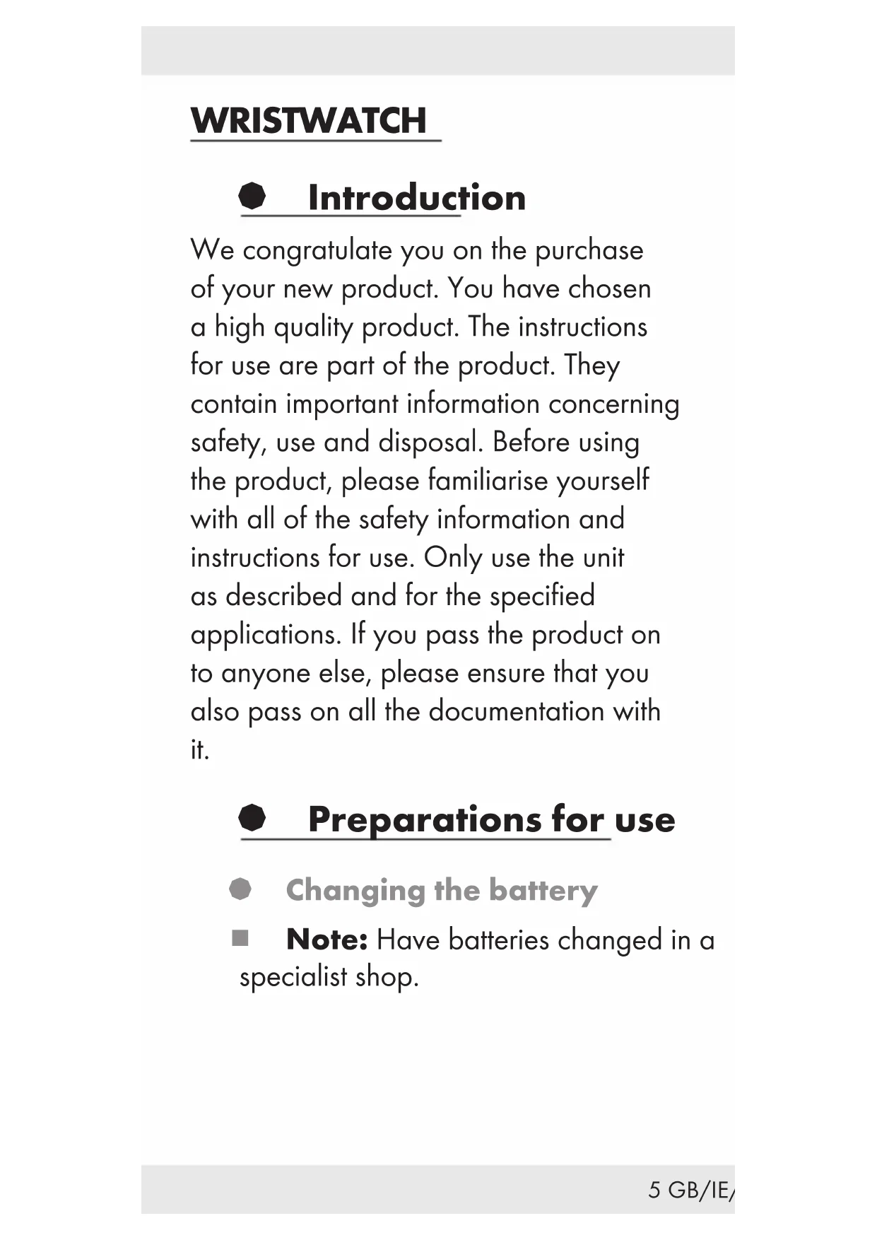 HG01064D/G/I/ J/K/ L/N/O/P/QC5 GB/IE/NI WRISTWATCH § Introduction We congratulate you on the purchase of your new product. You have chosen a high quality product. The instructions for use are part of the product. They contain important information concerning safety, use and disposal. Before using the product, please familiarise yourself with all of the safety information and instructions for use. Only use the unit as described and for the specified applications. If you pass the product on to anyone else, please ensure that you also pass on all the documentation with it. § Preparations for use § Changing the battery Note: Have batteries changed in a specialist shop.6 GB/IE/NI § Display