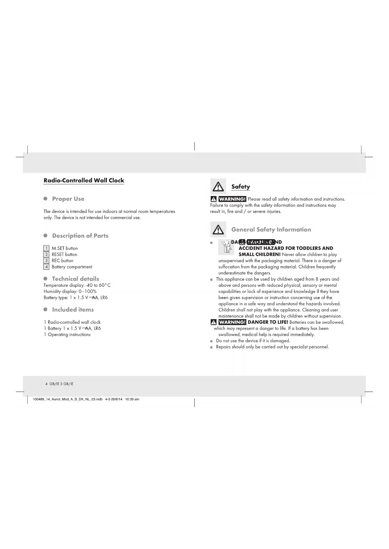 SMALL CHILDREN! Never allow children to play unsupervised with the packaging material. There is a danger of suffocation from the packaging material. Children frequently underestimate the dangers. This appliance can be used by children aged from 8 years and above and persons with reduced physical, sensory or mental capabilities or lack of experience and knowledge if they have been given supervision or instruction concerning use of the appliance in a safe way and understand the hazards involved. Children shall not play with the appliance. Cleaning and user maintenance shall not be made by children without supervision. DANGER TO LIFE! Batteries can be swallowed, which may represent a danger to life. If a battery has been swallowed, medical help is required immediately. Do not use the device if it is damaged. Repairs should only be carried out by specialist personnel. 100489_14_Auriol_Mod_A_B_DK_NL_03.indb 4-5 20/6/14 10:39 am6 GB/IE 7 GB/IE Safety Instructions for Batteries Remove the battery from the device if it is not going to be used for a prolonged period. CAUTION! DANGER OF EXPLOSION! The batteries must never be recharged! When inserting the battery, ensure the correct polarity! This is shown in the battery compartment. If necessary, clean the battery and device contacts before inserting the battery. Remove a spent battery immediately from the device. There is an increased danger of leaks! If the above instructions are not complied with, the battery may discharge itself beyond its end voltage. There is then a danger of leaking. If the battery has leaked inside your device, you should remove it immediately in order to prevent damage to the device! Batteries must not be disposed of in the normal domestic waste! Every consumer is legally obliged to dispose of batteries in the proper manner! Keep batteries away from children; do not throw batteries in the fire, short-circuit batteries or take them apart. Avoid contact with the skin, eyes and mucous membranes. Any parts of the body coming into contact with battery acid should be rinsed off with copious amounts of water and / or a doctor contacted if necessary! Preparing the product for use Remove the battery insulation strip from between the battery and the contact. Note: Reception may be considerably reduced by obstructions (e.g. concrete walls) or sources of interference (e.g. other electrical devices). In the event of reception problems, change the position of the wall clock (e.g. to somewhere near a window). Radio Signal (DCF): The DCF signal (time signal transmitter) consists of time pulses emitted by one of the most accurate clocks in the world close to Frankfurt / Main, Germany – this varies by 1 second in a million years. Your radio-controlled clock receives these signals under ideal conditions up to a distance of approx. 1,500 km around Frankfurt / Main. Reception of the radio signal generally takes approx. 3–12 minutes. Operation Receiving the DCF radio time signal The wall clock automatically starts to search for the DCF radio time signal. This process takes about 3–12 minutes to complete. The reception of the DCF radio time signal by the wall clock can also be started manually. 100489_14_Auriol_Mod_A_B_DK_NL_03.indb 6-7 20/6/14 10:39 am8 GB/IE 9 GB/IE Press and keep pressed the REC button