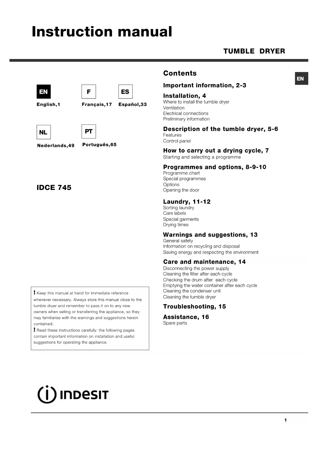 English,1 Contents Important information, 2-3 Installation, 4 Where to install the tumble dryerVentilationElectrical connectionsPreliminary information Description of the tumble dryer, 5-6 FeaturesControl panel How to carry out a drying cycle, 7 Starting and selecting a programme Programmes and options, 8-9-10 Programme chartSpecial programmesOptionsOpening the door Laundry, 11-12 Sorting laundryCare labelsSpecial garmentsDrying times Warnings and suggestions, 13 General safetyInformation on recycling and disposalSaving energy and respecting the environment Care and maintenance, 14 Disconnecting the power supplyCleaning the filter after each cycleChecking the drum after each cycleEmptying the water container after each cycleCleaning the condenser unitCleaning the tumble dryer Troubleshooting, 15 Assistance, 16 Spare parts