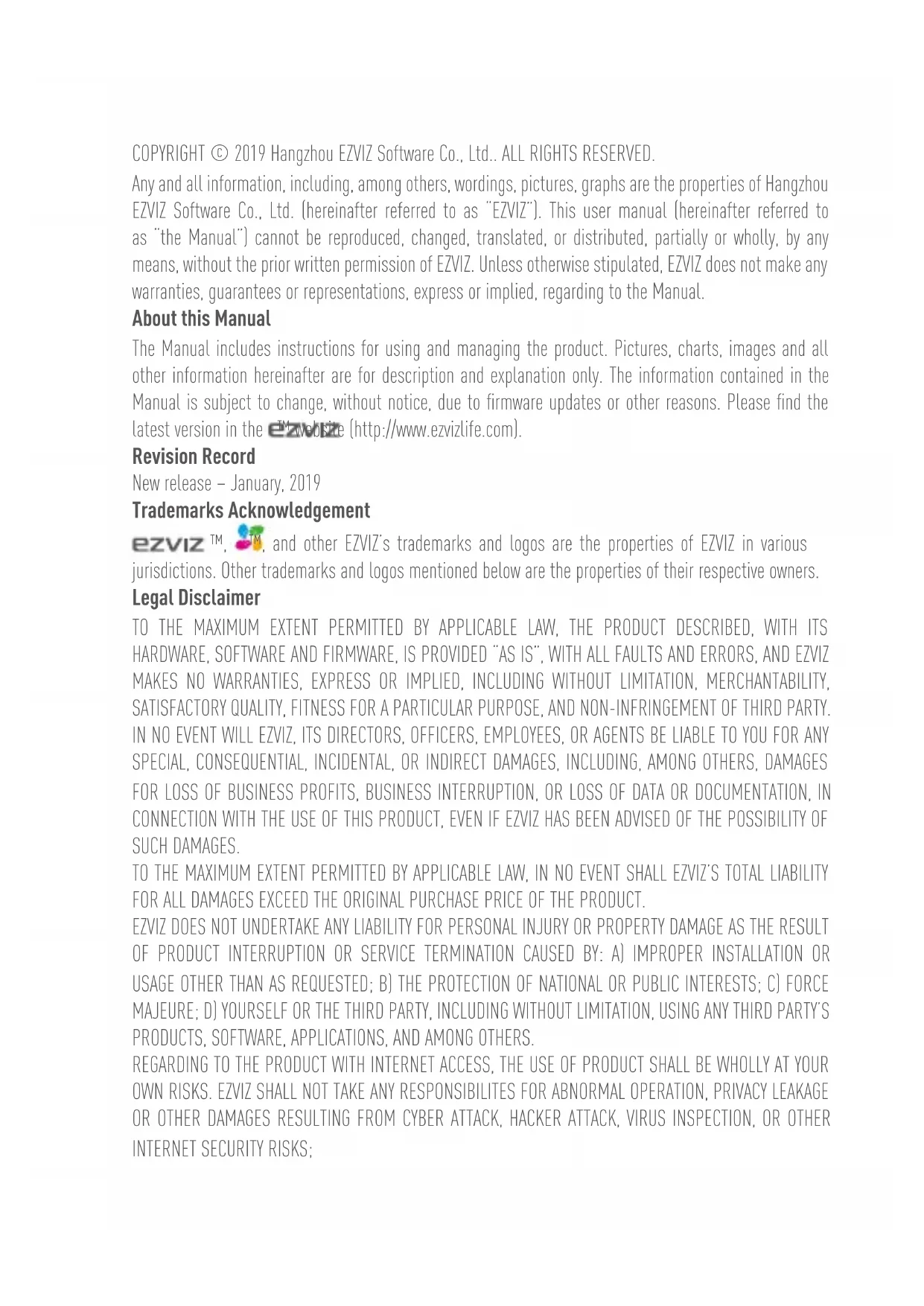 COPYRIGHT © 2019 Hangzhou EZVIZ Software Co., Ltd.. ALL RIGHTS RESERVED. Any and all information, including, among others, wordings, pictures, graphs are the properties of Hangzhou EZVIZ Software Co., Ltd. (hereinafter referred to as “EZVIZ”). This user manual (hereinafter referred to as “the Manual”) cannot be reproduced, changed, translated, or distributed, partially or wholly, by any means, without the prior written permission of EZVIZ. Unless otherwise stipulated, EZVIZ does not make any warranties, guarantees or representations, express or implied, regarding to the Manual. About this Manual The Manual includes instructions for using and managing the product. Pictures, charts, images and all other information hereinafter are for description and explanation only. The information contained in the Manual is subject to change, without notice, due to firmware updates or other reasons. Please find the latest version in the ™ website (http://www.ezvizlife.com). Revision Record New release – January, 2019 Trademarks Acknowledgement ™, ™, and other EZVIZ’s trademarks and logos are the properties of EZVIZ in various jurisdictions. Other trademarks and logos mentioned below are the properties of their respective owners. Legal Disclaimer TO THE MAXIMUM EXTENT PERMITTED BY APPLICABLE LAW, THE PRODUCT DESCRIBED, WITH ITS HARDWARE, SOFTWARE AND FIRMWARE, IS PROVIDED “AS IS”, WITH ALL FAULTS AND ERRORS, AND EZVIZ MAKES NO WARRANTIES, EXPRESS OR IMPLIED, INCLUDING WITHOUT LIMITATION, MERCHANTABILITY, SATISFACTORY QUALITY, FITNESS FOR A PARTICULAR PURPOSE, AND NON-INFRINGEMENT OF THIRD PARTY. IN NO EVENT WILL EZVIZ, ITS DIRECTORS, OFFICERS, EMPLOYEES, OR AGENTS BE LIABLE TO YOU FOR ANY SPECIAL, CONSEQUENTIAL, INCIDENTAL, OR INDIRECT DAMAGES, INCLUDING, AMONG OTHERS, DAMAGES FOR LOSS OF BUSINESS PROFITS, BUSINESS INTERRUPTION, OR LOSS OF DATA OR DOCUMENTATION, IN CONNECTION WITH THE USE OF THIS PRODUCT, EVEN IF EZVIZ HAS BEEN ADVISED OF THE POSSIBILITY OF SUCH DAMAGES. TO THE MAXIMUM EXTENT PERMITTED BY APPLICABLE LAW, IN NO EVENT SHALL EZVIZ’S TOTAL LIABILITY FOR ALL DAMAGES EXCEED THE ORIGINAL PURCHASE PRICE OF THE PRODUCT. EZVIZ DOES NOT UNDERTAKE ANY LIABILITY FOR PERSONAL INJURY OR PROPERTY DAMAGE AS THE RESULT OF PRODUCT INTERRUPTION OR SERVICE TERMINATION CAUSED BY: A) IMPROPER INSTALLATION OR USAGE OTHER THAN AS REQUESTED; B) THE PROTECTION OF NATIONAL OR PUBLIC INTERESTS; C) FORCE MAJEURE; D) YOURSELF OR THE THIRD PARTY, INCLUDING WITHOUT LIMITATION, USING ANY THIRD PARTY’S PRODUCTS, SOFTWARE, APPLICATIONS, AND AMONG OTHERS. REGARDING TO THE PRODUCT WITH INTERNET ACCESS, THE USE OF PRODUCT SHALL BE WHOLLY AT YOUR OWN RISKS. EZVIZ SHALL NOT TAKE ANY RESPONSIBILITES FOR ABNORMAL OPERATION, PRIVACY LEAKAGE OR OTHER DAMAGES RESULTING FROM CYBER ATTACK, HACKER ATTACK, VIRUS INSPECTION, OR OTHER INTERNET SECURITY RISKS;HOWEVER, EZVIZ WILL PROVIDE TIMELY TECHNICAL SUPPORT IF REQUIRED. SURVEILLANCE LAWS AND DATA PROTECTION LAWS VARY BY JURISDICTION. PLEASE CHECK ALL RELEVANT LAWS IN YOUR JURISDICTION BEFORE USING THIS PRODUCT IN ORDER TO ENSURE THAT YOUR USE CONFORMS TO THE APPLICABLE LAW. EZVIZ SHALL NOT BE LIABLE IN THE EVENT THAT THIS PRODUCT IS USED WITH ILLEGITIMATE PURPOSES. IN THE EVENT OF ANY CONFLICTS BETWEEN THE ABOVE AND THE APPLICABLE LAW, THE LATTER PREVAILS. Regulatory Information FCC Information This device complies with Part 15 of the FCC Rules. Operation is subject to the following two conditions: (1) This device may not cause harmful interference, and (2) This device must accept any interference received, including interference that may cause undesired operation. Note: This product has been tested and found to comply with the limits for a Class B digital device, pursuant to Part 15 of the FCC Rules. These limits are designed to provide reasonable protection against harmful interference in a residential installation. This product generates, uses, and can radiate radio frequency energy and, if not installed and used in accordance with the instructions, may cause harmful interference to radio communications. However, there is no guarantee that interference will not occur in a particular installation. If this product does cause harmful interference to radio or television reception, which can be determined by turning the equipment off and on, the user is encouraged to try to correct the interference by one or more of the following measures: —Reorient or relocate the receiving antenna. —Increase the separation between the equipment and receiver. —Connect the equipment into an outlet on a circuit different from that to which the receiver is connected. —Consult the dealer or an experienced radio/TV technician for help. Please take attention that changes or modification not expressly approved by the party responsible for compliance could void the user’s authority to operate the equipment. This equipment should be installed and operated with a minimum distance 20cm between the radiator and your body. This device complies with Industry Canada licence-exempt RSS standard(s). Operation is subject to the following two conditions: (1) this device may not cause interference, and (2) this device must accept any interference, including interference that may cause undesired operation of the device. Under Industry Canada regulations, this radio transmitter may only operate using an antenna of a type and maximum (or lesser) gain approved for the transmitter by Industry Canada. To reduce potential radio interference to other users, the antenna type and its gain should be so chosen that the equivalent isotropically radiated power (e.i.r.p.) is not more than that necessary for successful communication.SAVE THIS MANUAL FOR FUTURE REFERENCE EU Conformity Statement This product and - if applicable - the supplied accessories too are marked with "CE" and comply therefore with the applicable harmonized European standards listed under the Radio Equipment Directive 2014/53/EU, t