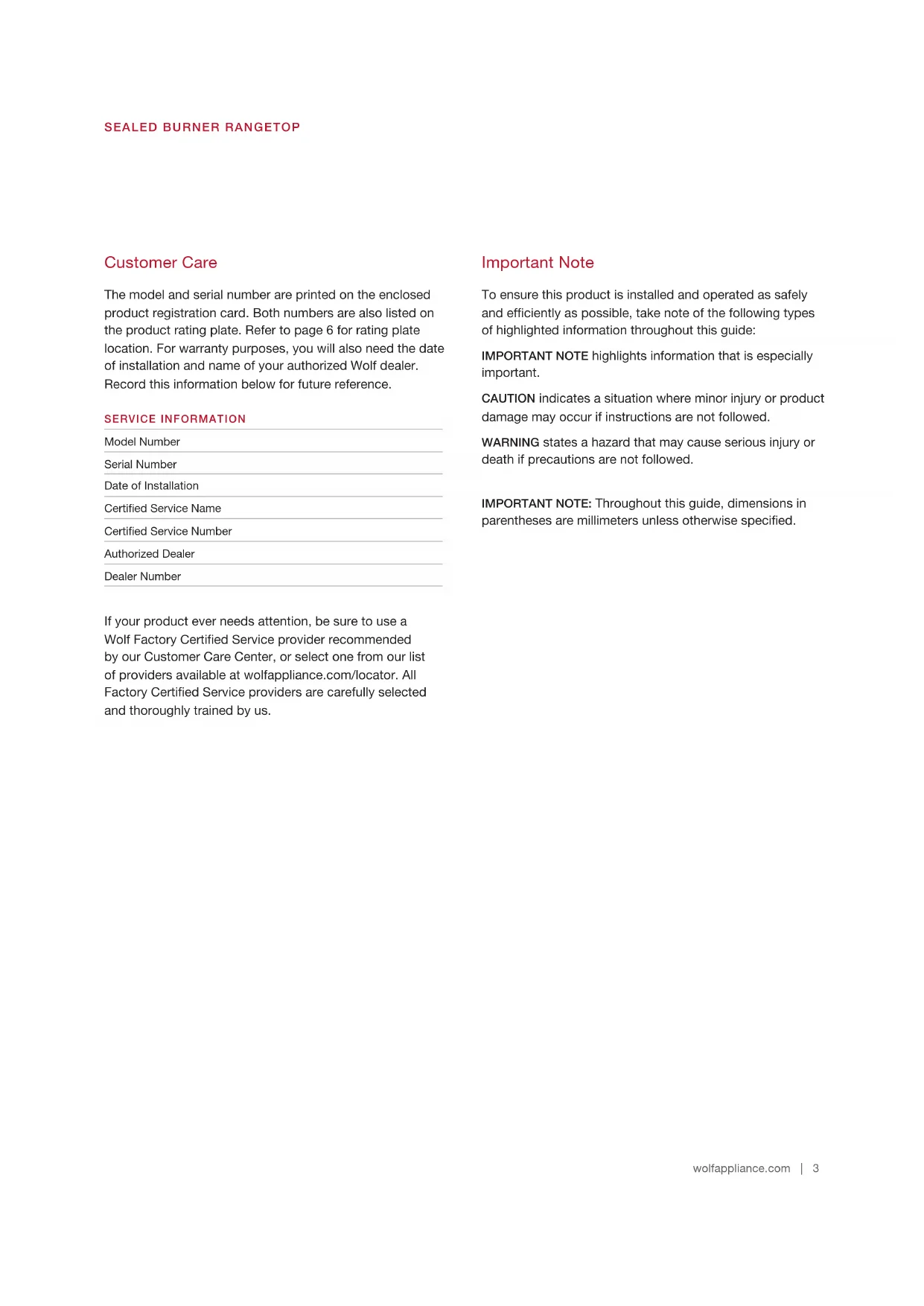 CLEANING, MAINTENANCE, AND MORE2 | Wolf Customer Care 800.222.7820 Contents 4 Safety Precautions 6 Sealed Burner Rangetop Features 7 Rangetop Operation 12 Care Recommendations 13 Troubleshooting 15 Wolf Warranty SEALED BURNER RANGETOPwolfappliance.com | 3 Customer Care The model and serial number are printed on the enclosed product registration card. Both numbers are also listed on the product rating plate. Refer to page 6 for rating plate location. For warranty purposes, you will also need the date of installation and name of your authorized Wolf dealer. Record this information below for future reference. SERVICE INFORMATION Model Number Serial Number Date of Installation Certied Service Name Certied Service Number Authorized Dealer Dealer Number If your product ever needs attention, be sure to use a Wolf Factory Certied Service provider recommended by our Customer Care Center, or select one from our list of providers available at wolfappliance.com/locator. All Factory Certied Service providers are carefully selected and thoroughly trained by us.