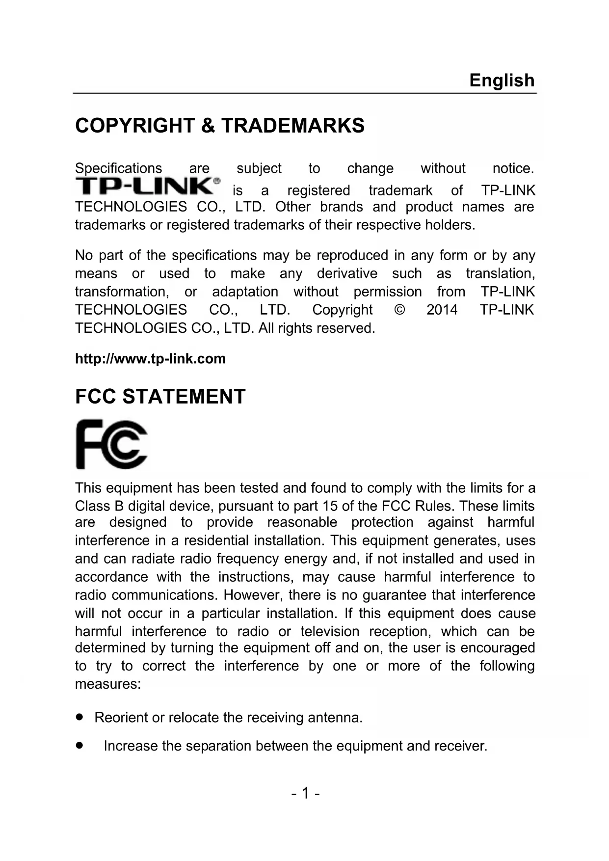 COPYRIGHT & TRADEMARKS Specifications are subject to change without notice. is a registered trademark of TP-LINK TECHNOLOGIES CO., LTD. Other brands and product names are trademarks or registered trademarks of their respective holders. No part of the specifications may be reproduced in any form or by any means or used to make any derivative such as translation, transformation, or adaptation without permission from TP-LINK TECHNOLOGIES CO., LTD. Copyright © 2014 TP-LINK TECHNOLOGIES CO., LTD. All rights reserved. http://www.tp-link.com FCC STATEMENT This equipment has been tested and found to comply with the limits for a Class B digital device, pursuant to part 15 of the FCC Rules. These limits are designed to provide reasonable protection against harmful interference in a residential installation. This equipment generates, uses and can radiate radio frequency energy and, if not installed and used in accordance with the instructions, may cause harmful interference to radio communications. However, there is no guarantee that interference will not occur in a particular installation. If this equipment does cause harmful interference to radio or television reception, which can be determined by turning the equipment off and on, the user is encouraged to try to correct the interference by one or more of the following measures: Reorient or relocate the receiving antenna. Increase the separation between the equipment and receiver.English