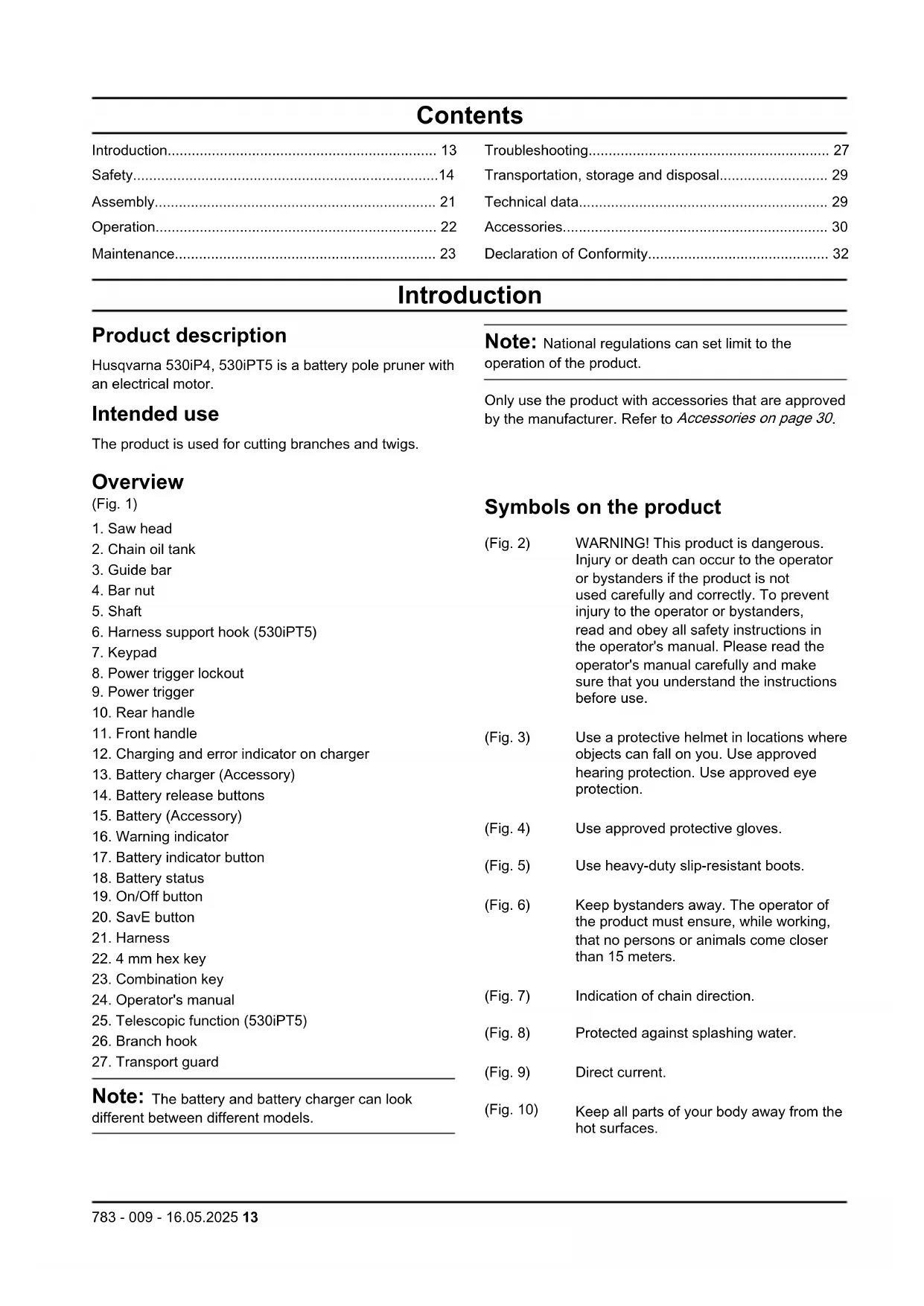 Note: The battery and battery charger can look different between different models. Symbols on the product (Fig. 2) WARNING! This product is dangerous. Injury or death can occur to the operator or bystanders if the product is not used carefully and correctly. To prevent injury to the operator or bystanders, read and obey all safety instructions in the operator's manual. Please read the operator's manual carefully and make sure that you understand the instructions before use. (Fig. 3) Use a protective helmet in locations where objects can fall on you. Use approved hearing protection. Use approved eye protection. (Fig. 4) Use approved protective gloves. (Fig. 5) Use heavy-duty slip-resistant boots. (Fig. 6) Keep bystanders away. The operator of the product must ensure, while working, that no persons or animals come closer than 15 meters. (Fig. 7) Indication of chain direction. (Fig. 8) Protected against splashing water. (Fig. 9) Direct current. (Fig. 10) Keep all parts of your body away from the hot surfaces.