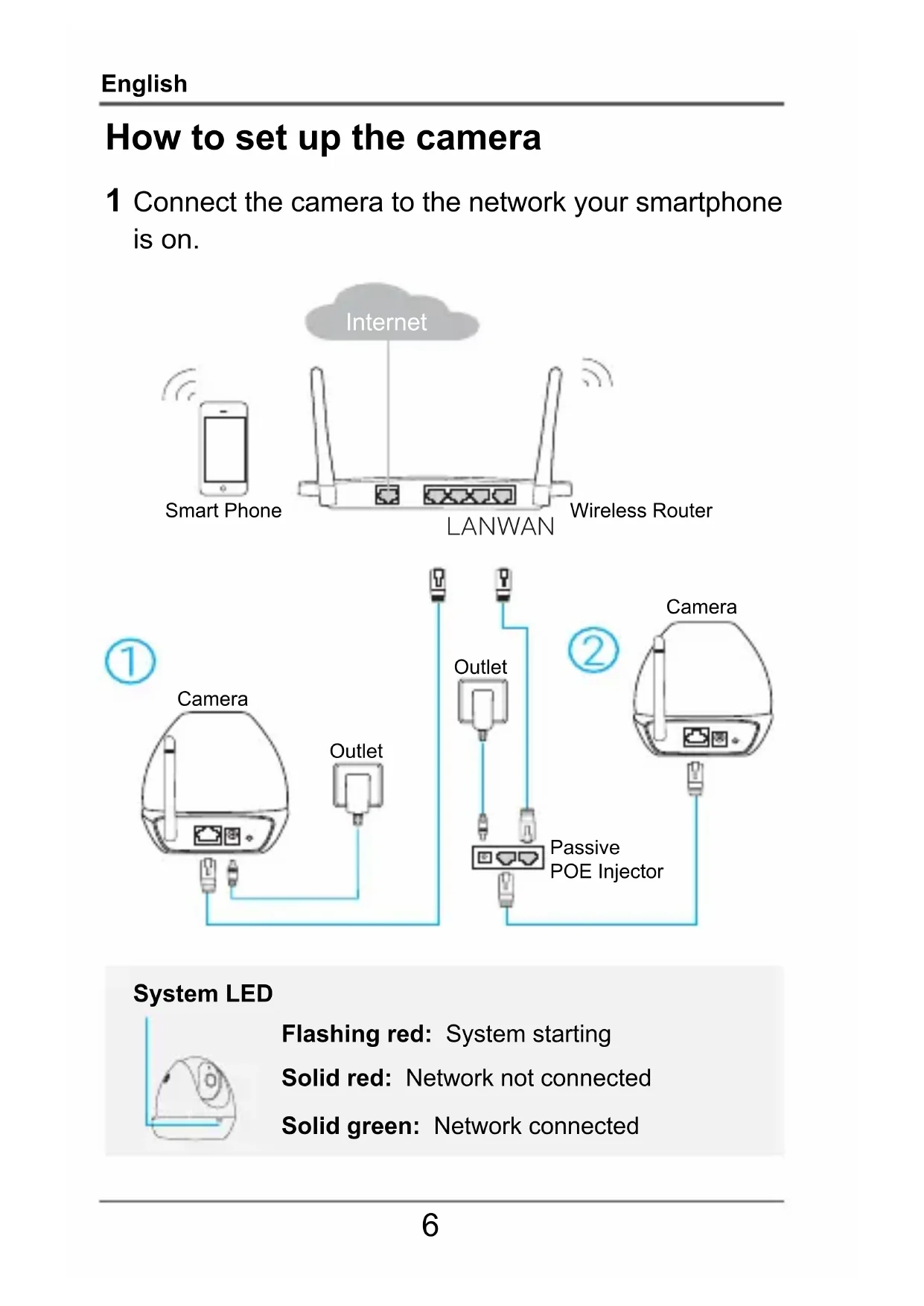 Connect the camera to the network your smartphone is on. LANWAN System LED Flashing red: System startingSolid red: Network not connectedSolid green: Network connectedInternetPassive POE InjectorCameraCameraWireless RouterSmart PhoneOutletOutletEnglish