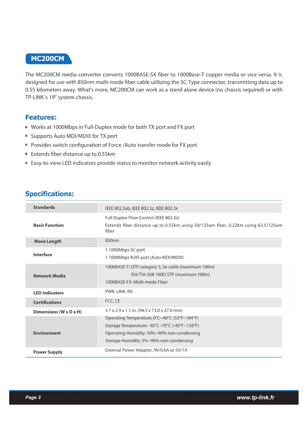 Operating Temperature: 0°C~40°C (32°F~104°F) Storage Temperature: -40°C~70°C (-40°F~158°F) Operating Humidity: 10%~90% non-condensing Storage Humidity: 5%~90% non-condensing External Power Adapter, 9V/0.6A or 5V/1A The MC100CM media converter converts 100BASE-FX ber to 100Base-TX copper media or vice versa. It is designed for use with 1310nm multi-mode ber cable utilizing the SC-Type connector, transmitting data up to 2 kilometers. What's more, MC100CM can work as a stand alone device (no chassis required)or with TP-LINK’s 19’’ system chassis, and is equipped with Link Fault Pass Through which minimizes the loss caused by link failure. Auto-negotiation of 10/100Mbps and Auto MDI/MDIX for TX port Provide switch conguration of Half-Duplex / Full-Duplex transfer mode for TX port Link Fault Pass Through and Far End Fault minimize the loss caused by link failure timely Extend ber distance up to 2km Easy-to-view LED indicators provide status to monitor network activity easily MC100CMwww.tp-link.com Page 7 Features: Specifications: Standards Basic Function Interface Network Media LED Indicators Certications Dimensions (W x D x H) Environment Power Supply IEEE 802.3u, IEEE 802.3x Half/Full-Duplex transfer mode for TX port Full Duplex Flow Control (IEEE 802.3x) Half Duplex Flow Control (Backpressure) Extends ber distance up to 20km Link Fault Pass Through and Far End Fault minimize the loss caused by link failure timely 1 100Mbps SC port 1 100Mbps RJ45 port (Auto MDI/MDIX) 10BASE-T: UTP category 3, 4, 5 cable (maximum 100m) EIA/TIA-568 100Ω STP (maximum 100m) 100BASE-T: UTP category 5, 5e cable (maximum 100m) EIA/TIA-568 100Ω STP (maximum 100m) 100BASE-FX: Single-mode Fiber PWR, SPD, LFP, FDX/Col, Link/Act FCC, CE