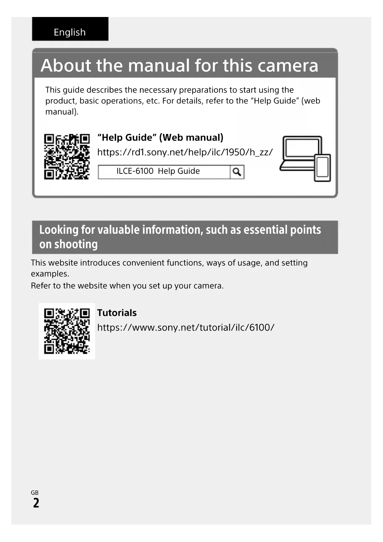 \\Win-473\camera\CX88400(PD)\Multi\06_Compose\5009876411_14lang\5009876411ILCE6100CEC\01GB-ILCE6100CEC\01GB.indd DTP data saved: 2019/07/30 13:54 PDF file created: 2019/07/31 09:15 Looking for valuable information, such as essential points on shooting This website introduces convenient functions, ways of usage, and setting examples.Refer to the website when you set up your camera. About the manual for this camera This guide describes the necessary preparations to start using the product, basic operations, etc. For details, refer to the “Help Guide” (web manual). https://rd1.sony.net/help/ilc/1950/h_zz/ “Help Guide” (Web manual) ILCE-6100 Help Guide Tutorials https://www.sony.net/tutorial/ilc/6100/ EnglishILCE-61005-009-876-41(1)