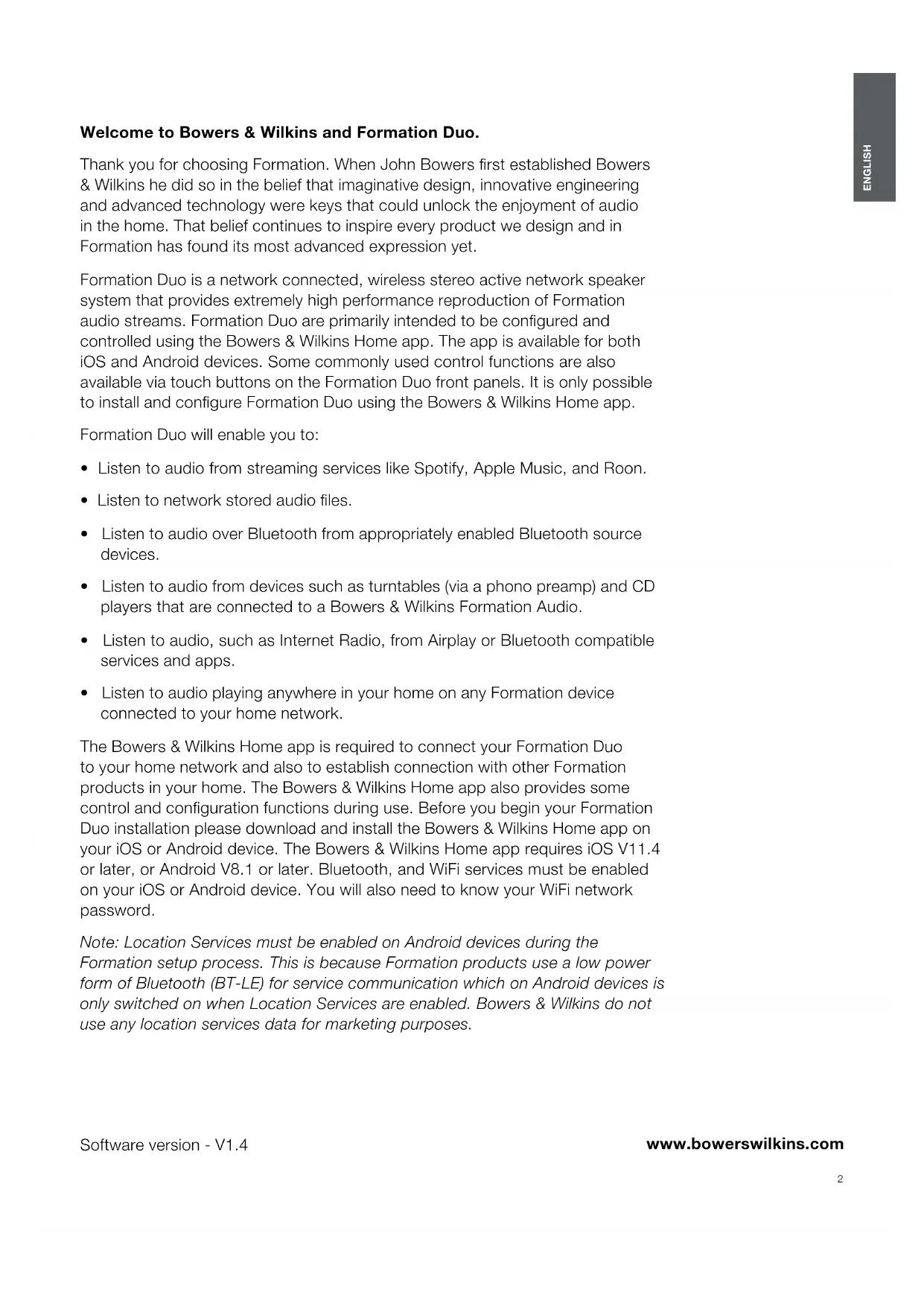 - Listen to audio playing anywhere in your home on any Formation device connected to your home network. The Bowers & Wilkins Home app is required to connect your Formation Duo to your home network and also to establish connection with other Formation products in your home. The Bowers & Wilkins Home app also provides some control and conguration functions during use. Before you begin your Formation Duo installation please download and install the Bowers & Wilkins Home app on your iOS or Android device. The Bowers & Wilkins Home app requires iOS V11.4 or later, or Android V8.1 or later. Bluetooth, and WiFi services must be enabled on your iOS or Android device. You will also need to know your WiFi network password. Note: Location Services must be enabled on Android devices during the Formation setup process. This is because Formation products use a low power form of Bluetooth (BT-LE) for service communication which on Android devices is only switched on when Location Services are enabled. Bowers & Wilkins do not use any location services data for marketing purposes. Software version - V1.4 ENGLISH Contents ENGLISH 2