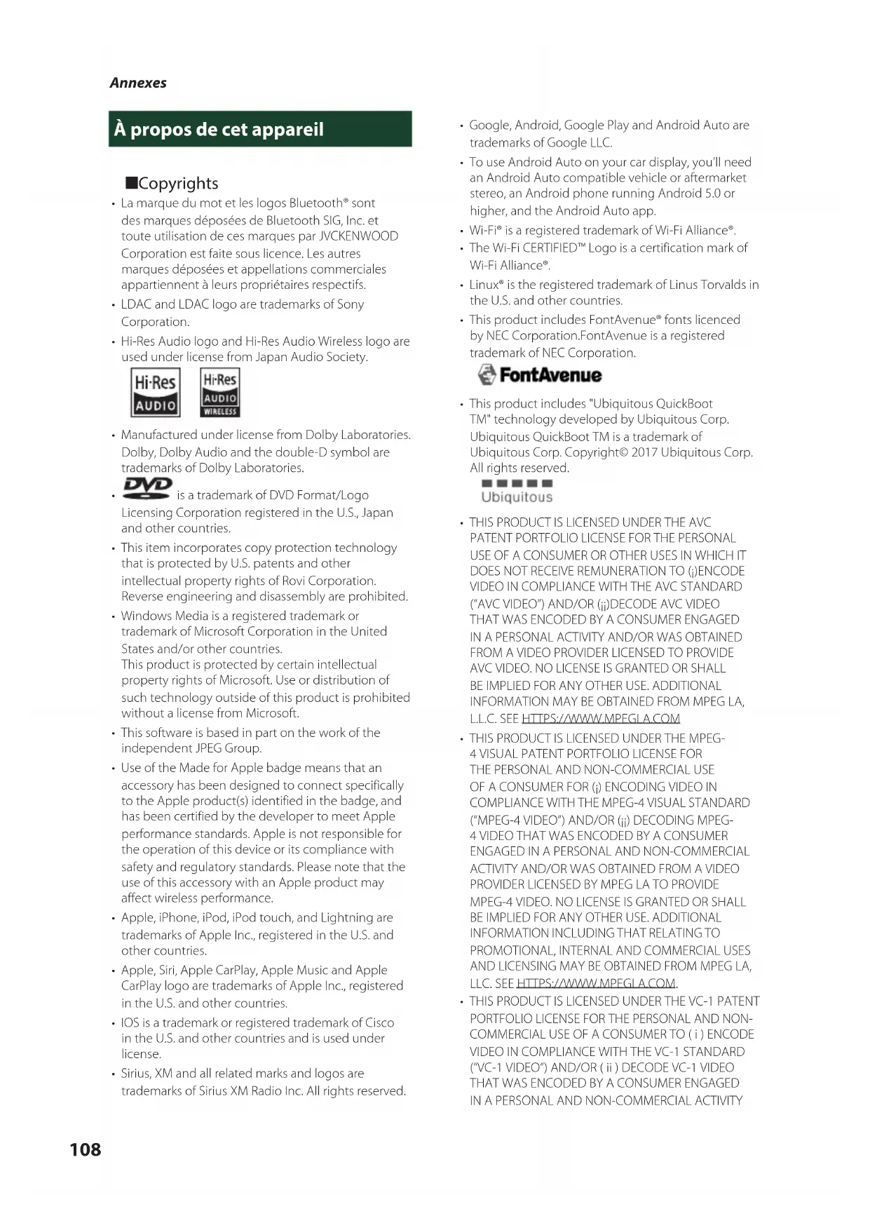 - Les informations les plus récentes (dernier mode d'emploi, mises à jour du système, nouvelles fonctions, etc.) sont disponibles sur <https://www.jvc.net/cs/car/>.2 Important Notice on Software Ñ Software License on This Product The software embedded in this product comprises a number of independent software components, each of which is copyrighted by JVCKENWOOD Corporation or by a third party. This product uses software components that are based on an End-User License Agreement (hereinafter called “EULA”) stipulated by JVCKENWOOD Corporation and by third parties. The EULA dictates the availability of the source codes of free-software components as a prerequisite to distributing them in executable form under the terms of the GNU General Public License or the Lesser General Public License (hereinafter called “GPL/LGPL”). To get information about the software components that are subject to the terms of the GPL/LGPL, please visit the following Website: Website URL https://www3.jvckenwood.com/ english/download/gpl/ Queries concerning the contents of the source code or the like will not be accepted. Please note that software components based on a EULA that is not subject to the terms of the GPL/LGPL or those that have been developed or created by JVCKENWOOD Corporation will be excluded from the scope of source code disclosure. Because licenses to use software components distributed under the GPL/LGPL are offered to the customers for free of charge, no warranty is granted to the customers, whether explicitly or implicitly, to the extent of the applicable laws. Unless otherwise stipulated by the applicable laws or agreed upon in writing, the copyright holders or those who are entitled to modify and redistribute the software components are not held responsible for any and all damages resulting from their use or from inability to use them. For more information about the terms of use of the software components, required items of compliance and so on, please refer to the GPL/LGPL. Customers wishing themselves to use a software component that is subject to the GPL/LGPL embedded in this product are encouraged to read the terms of the corresponding license before use. Because each individual license is prescribed by a third party other than JVCKENWOOD Corporation, the original (English) of the license is presented. EULA Ñ Software License Agreement JVCKENWOOD Corporation (hereinafter called “Licensor”) holds either the copyright to the embedded software or the right to sublicense it. This agreement establishes the conditions under which the customer uses this “Licensed Software.” The customer shall agree to the terms of this license agreement before proceeding to use Licensed Software. This agreement is deemed to have taken effect when the customer (hereinafter called “User”) has used a product implementation of Licensed Software. The Licensed Software may contain software Licensor has been licensed to use by third parties directly or indirectly. Some third parties may have terms of use prescribed for their customers, apart from this Software License Agreement. This agreement does not apply to such software. Be sure to consult “Important Notice on Software” as presented separately. Article 1 (General) Licensor grants to User a non-exclusive, non- assignable right of use Licensed Software within the country where the User purchases the Product (hereinafter the "Country") (except for the exception provided for in Paragraph 1, Article 3). Article 2 (Right of Use)