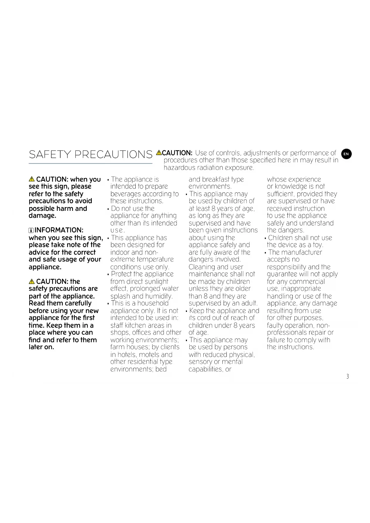 SAFETY PRECAUTIONS CAUTION: when you see this sign, please refer to the safety precautions to avoid possible harm and damage INFORMATION: when you see this sign, please take note of the advice for the correct and safe usage of your appliance CAUTION: the safety precautions are part of the appliance Read them carefully before using your new appliance for the first time Keep them in a place where you can find and refer to them later on