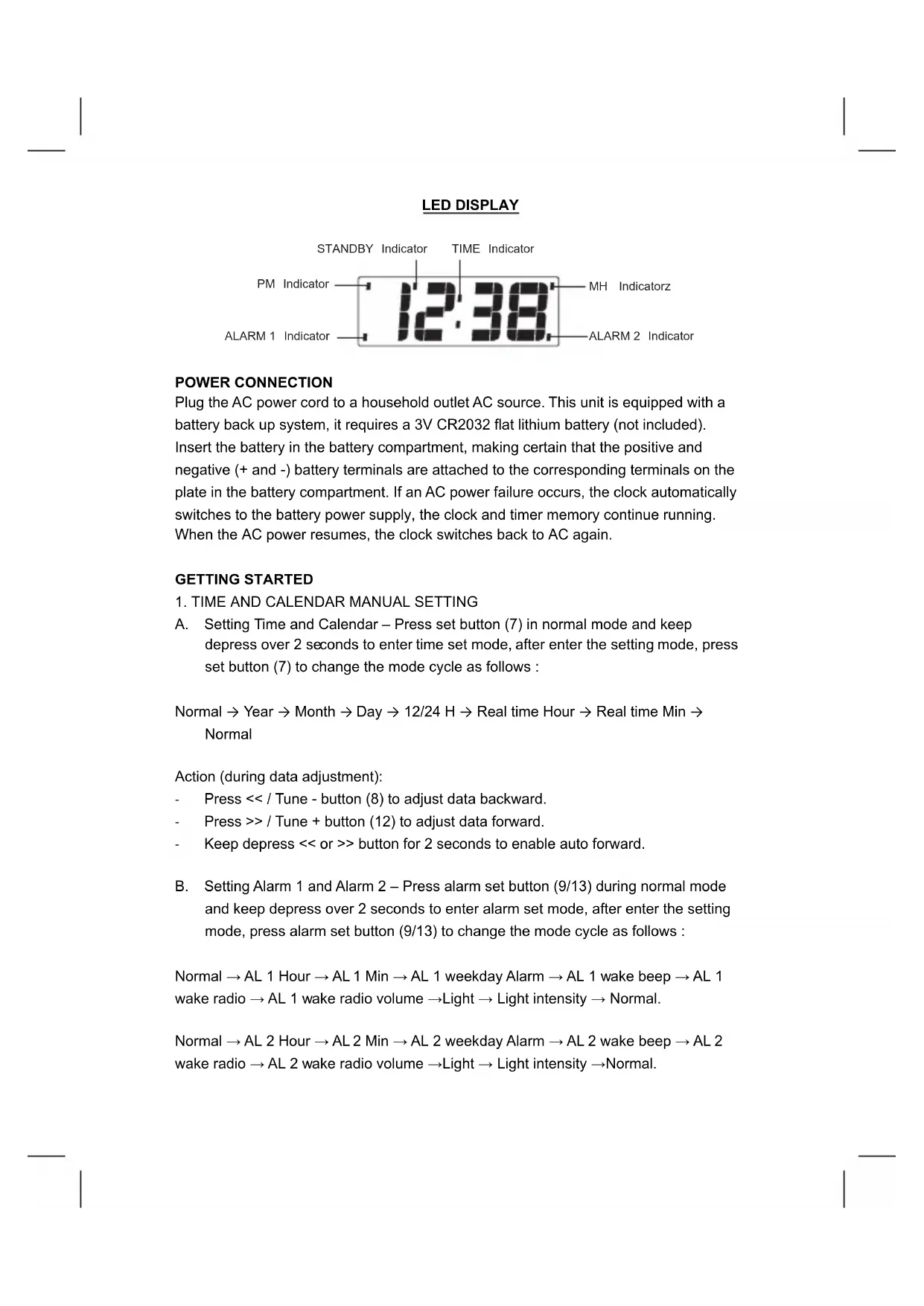 Alarm Duration – Beep alarm or radio alarm will continue output for 30 minutes if no key press, then it will stop automatically and wait for same alarm time on next day.