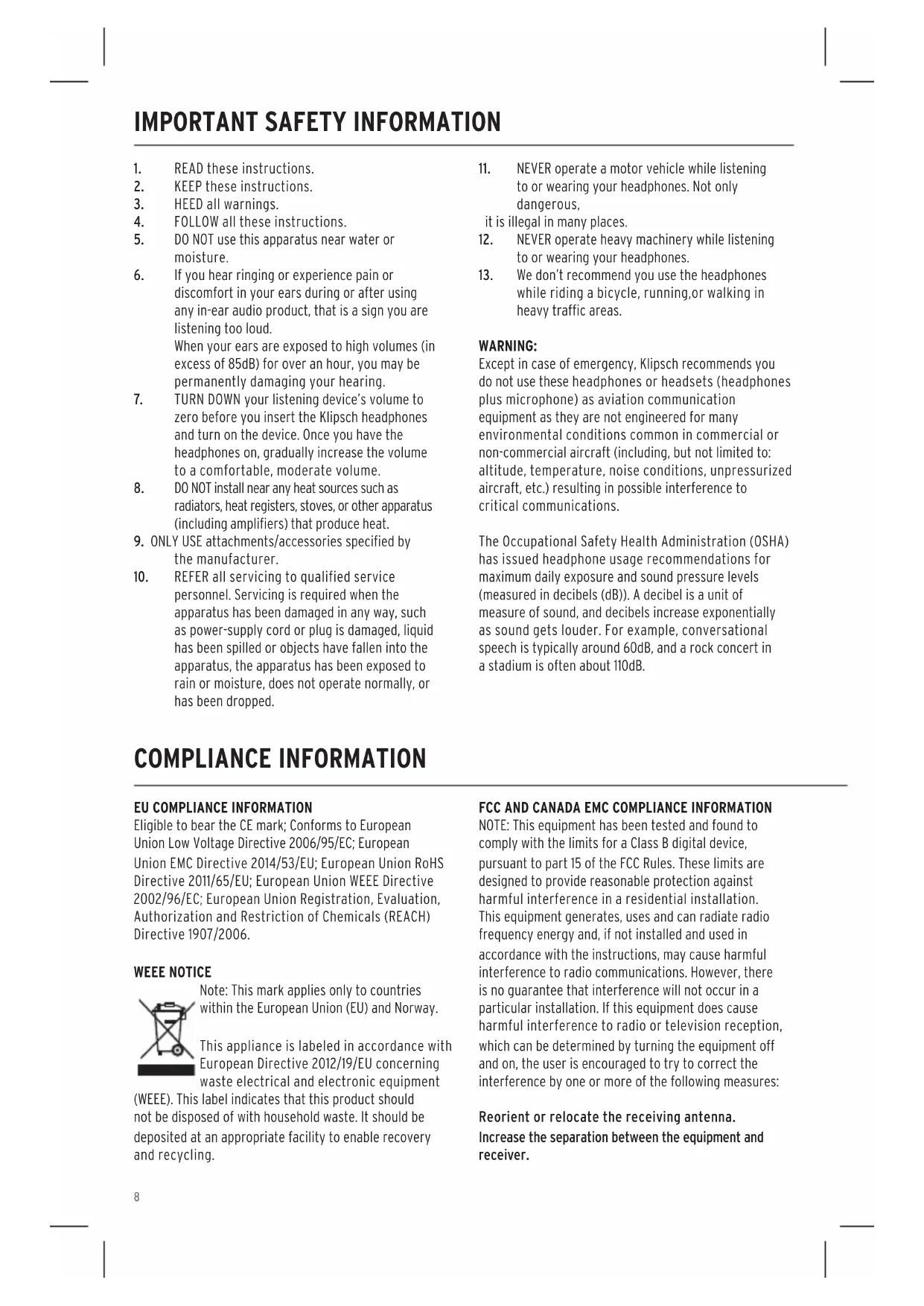 Except in case of emergency, Klipsch recommends you do not use these headphones or headsets (headphones plus microphone) as aviation communication equipment as they are not engineered for many environmental conditions common in commercial or non-commercial aircraft (including, but not limited to: altitude, temperature, noise conditions, unpressurized aircraft, etc.) resulting in possible interference to critical communications. The Occupational Safety Health Administration (OSHA) has issued headphone usage recommendations for maximum daily exposure and sound pressure levels (measured in decibels (dB)). A decibel is a unit of measure of sound, and decibels increase exponentially as sound gets louder. For example, conversational speech is typically around 60dB, and a rock concert in a stadium is often about 110dB.