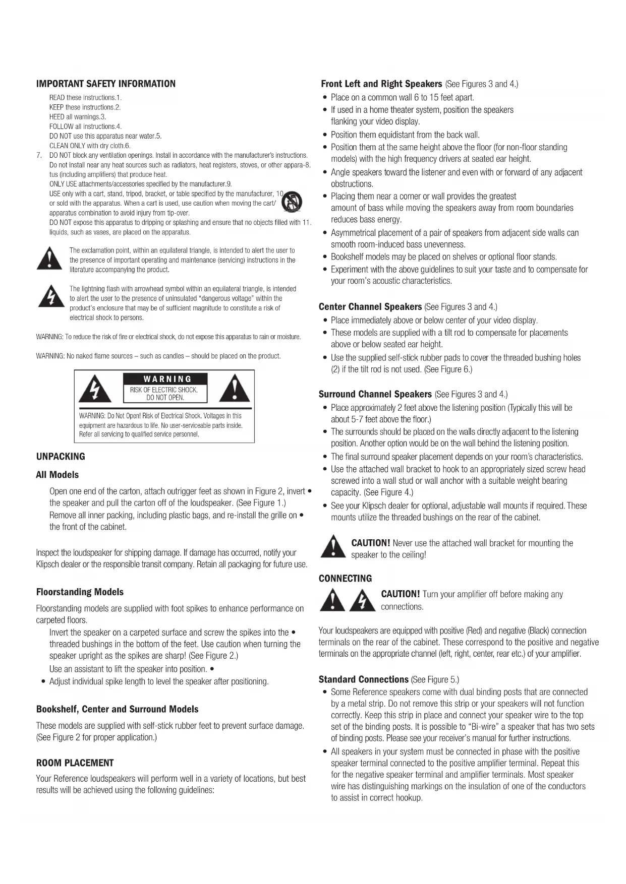 UNPACKING All Models Open one end of the carton, attach outrigger feet as shown in Figure 2, invert • the speaker and pull the carton off of the loudspeaker. (See Figure 1.) Remove all inner packing, including plastic bags, and re-install the grille on • the front of the cabinet. Inspect the loudspeaker for shipping damage. If damage has occurred, notify your Klipsch dealer or the responsible transit company. Retain all packaging for future use. Floorstanding Models Floorstanding models are supplied with foot spikes to enhance performance on carpeted floors. Invert the speaker on a carpeted surface and screw the spikes into the • threaded bushings in the bottom of the feet. Use caution when turning the speaker upright as the spikes are sharp! (See Figure 2.) Use an assistant to lift the speaker into position. • Adjust individual spike length to level the speaker after positioning.• Bookshelf, Center and Surround Models These models are supplied with self-stick rubber feet to prevent surface damage. (See Figure 2 for proper application.) ROOM PLACEMENT Your Reference loudspeakers will perform well in a variety of locations, but best results will be achieved using the following guidelines: Front Left and Right Speakers (See Figures 3 and 4.) Place on a common wall 6 to 15 feet apart. • If used in a home theater system, position the speakers • flanking your video display. Position them equidistant from the back wall.• Position them at the same height above the floor (for non-floor standing • models) with the high frequency drivers at seated ear height. Angle speakers toward the listener and even with or forward of any adjacent • obstructions. Placing them near a corner or wall provides the greatest • amount of bass while moving the speakers away from room boundaries reduces bass energy. Asymmetrical placement of a pair of speakers from adjacent side walls can • smooth room-induced bass unevenness. Bookshelf models may be placed on shelves or optional floor stands.• Experiment with the above guidelines to suit your taste and to compensate for • your room’s acoustic characteristics. Center Channel Speakers (See Figures 3 and 4.) Place immediately above or below center of your video display.• These models are supplied with a tilt rod to compensate for placements • above or below seated ear height. Use the supplied self-stick rubber pads to cover the threaded bushing holes • (2) if the tilt rod is not used. (See Figure 6.) Surround Channel Speakers (See Figures 3 and 4.) Place approximately 2 feet above the listening position (Typically this will be • about 5-7 feet above the floor.) The surrounds should be placed on the walls directly adjacent to the listening • position. Another option would be on the wall behind the listening position. The final surround speaker placement depends on your room’s characteristics.• Use the attached wall bracket to hook to an appropriately sized screw head • screwed into a wall stud or wall anchor with a suitable weight bearing capacity. (See Figure 4.) See your Klipsch dealer for optional, adjustable wall mounts if required. These • mounts utilize the threaded bushings on the rear of the cabinet. CAUTION! Never use the attached wall bracket for mounting the speaker to the ceiling! CONNECTING CAUTION! Turn your amplifier off before making any connections. Your loudspeakers are equipped with positive (Red) and negative (Black) connection terminals on the rear of the cabinet. These correspond to the positive and negative terminals on the appropriate channel (left, right, center, rear etc.) of your amplifier. Standard Connections (See Figure 5.) Some Reference speakers come with dual binding posts that are connected • by a metal strip. Do not remove this strip or your speakers will not function correctly. Keep this strip in place and connect your speaker wire to the top set of the binding posts. It is possible to “Bi-wire” a speaker that has two sets of binding posts. Please see your receiver’s manual for further instructions. All speakers in your system must be connected in phase with the positive • speaker terminal connected to the positive amplifier terminal. Repeat this for the negative speaker terminal and amplifier terminals. Most speaker wire has distinguishing markings on the insulation of one of the conductors to assist in correct hookup. WARNING RISK OF ELECTRIC SHOCK. DO NOT OPEN.WARNING: Do Not Open! Risk of Electrical Shock. Voltages in this equipment are hazardous to life. No user-serviceable parts inside. Refer all servicing to qualified service personnel.Use 16 gauge (AWG), two conductor, copper wire at a minimum and larger • gauge wire for longer runs. The connection terminals on your loudspeaker will accommodate bare wire, spade terminals or banana type plugs. Use either pair of positive and negative terminals keeping the metal coupling • straps in place. CAUTION! With all connection types, take care that there is no contact between the positive and negative terminals at the speaker and amplifier. Damage to your equipment may result! Bass Management When using your speakers in a home theater system, consult the owner’s manual of your surround electronics for proper application of bass management settings. As a general rule, compact speakers (Bookshelf, Center Channel and Sur-• rounds) are set to the “Small,” or bass-limited setting. Floorstanding speakers are typically set to the “Large,” or full-range setting.• Also refer to the electronics instructions for adjusting the relative volume levels • of the speakers so they are at the same level when in the listening position.