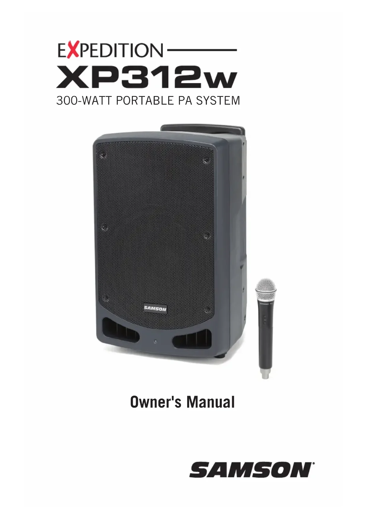 - Consult the dealer or an experienced radio/TV technician for help. RF Warning Statement The device has been evaluated to meet general RF exposure requirement. The device can be used in portable exposure condition without restriction. This device complies with RSS-310 of Industry Canada. Operation is subject to the condition that this device does not cause harmful interference. Hereby, Samson Technologies Corp., declares that this Expedition XP312w is in compliance with the essential requirements and other relevant provisions of Directive 2014/53/EU. The declaration of conformity may be consulted at: http://www.samsontech.com/site_media/support/manuals/XP312w_DOC.pdf6 Introduction Thank you for purchasing the XP312w battery-powered portable sound system, featuring wireless Bluetooth® connectivity. Lightweight and compact, the XP312w features 300 watts of power weighing only 38 pounds, making it an excellent complement to any mobile speaker application. The internal rechargeable battery provides up to 12 hours of continuous use. The XP312w can also be AC powered (with the included power cord). The retractable handle and integrated wheels, make the XP312w easy to transport to any outing. The XP312w is a complete all-in-one solution providing the flexibility of a four-channel mixer (with inputs for microphones and line level devices), a line output for linking multiple speakers, and Voiceover priority ducking. For a completely untethered performance, the XP312w includes a Samson Concert 88a Handheld Wireless system and an additional slot to add a second Concert 88a system. There is also a USB jack for adding a Samson XPD Series wireless system. Whether you are looking for a sound system for use outdoors, in the classroom, for karaoke, for presentations, or performing live music, the XP312w provides high quality, portable audio in a small self-powered package. We recommend you keep the following records for reference, as well as a copy of your sales receipt. Serial number: ______________________________________________________ Date of purchase: ___________________________________________________ If you have any questions or comments regarding the XP312w Portable PA System or any other products from Samson, do not hesitate to contact us at support@samsontech.com. With proper care and maintenance, your XP312w Portable PA System will operate trouble- free for many years. Should your XP312w Portable PA System ever require servicing, a Return Authorization (RA) number must be obtained before shipping your unit to Samson. Without this number, the unit will not be accepted. Please visit www.samsontech.com/ra for an RA number prior to shipping your unit. Please retain the original packing materials and, if possible, return the unit in its original carton. If your XP312w Portable PA System was purchased outside of the United States, contact your local distributor. Features