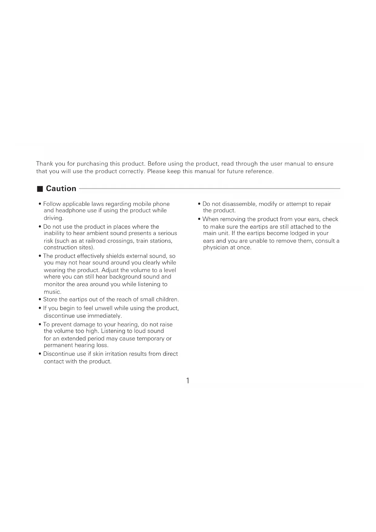 - When removing the product from your ears, check to make sure the eartips are still attached to the main unit. If the eartips become lodged in your ears and you are unable to remove them, consult a physician at once.2