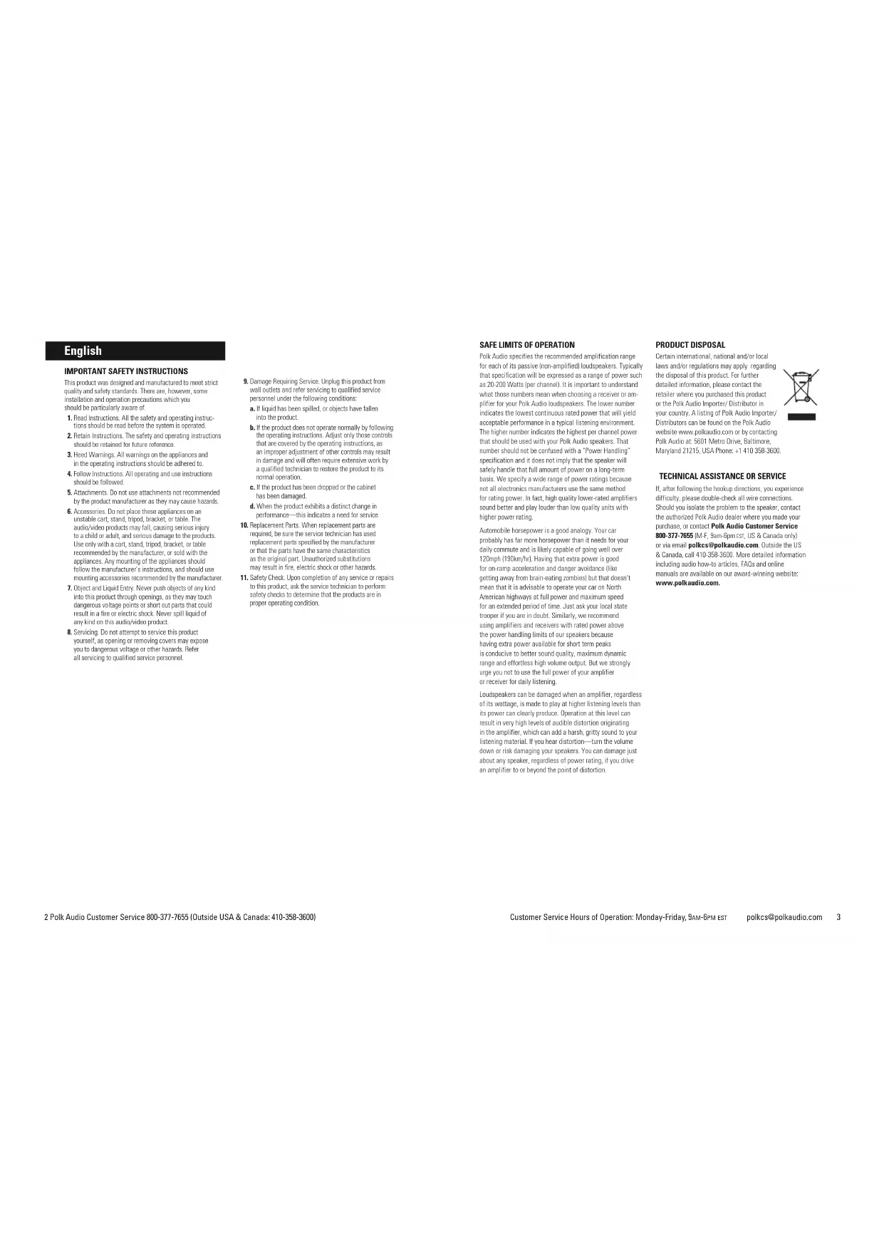 Polk Audio specifies the recommended amplification range for each of its passive (non-amplified) loudspeakers. Typically that specification will be expressed as a range of power such as 20-200 Watts (per channel). It is important to understand what those numbers mean when choosing a receiver or am- plifier for your Polk Audio loudspeakers. The lower number indicates the lowest continuous rated power that will yield acceptable performance in a typical listening environment. The higher number indicates the highest per channel power that should be used with your Polk Audio speakers. That number should not be confused with a “Power Handling” specification and it does not imply that the speaker will safely handle that full amount of power on a long-term basis. We specify a wide range of power ratings because not all electronics manufacturers use the same method for rating power. In fact, high quality lower-rated amplifiers sound better and play louder than low quality units with higher power rating. Automobile horsepower is a good analogy. Your car probably has far more horsepower than it needs for your daily commute and is likely capable of going well over 120mph (190km/hr). Having that extra power is good for on-ramp acceleration and danger avoidance (like getting away from brain-eating zombies) but that doesn’t mean that it is advisable to operate your car on North American highways at full power and maximum speed for an extended period of time. Just ask your local state trooper if you are in doubt. Similarly, we recommend using amplifiers and receivers with rated power above the power handling limits of our speakers because having extra power available for short term peaks is conducive to better sound quality, maximum dynamic range and effortless high volume output. But we strongly urge you not to use the full power of your amplifier or receiver for daily listening. Loudspeakers can be damaged when an amplifier, regardless of its wattage, is made to play at higher listening levels than its power can clearly produce. Operation at this level can result in very high levels of audible distortion originating in the amplifier, which can add a harsh, gritty sound to your listening material. If you hear distortion—turn the volume down or risk damaging your speakers. You can damage just about any speaker, regardless of power rating, if you drive an amplifier to or beyond the point of distortion. PRODUCT DISPOSAL Certain international, national and/or local laws and/or regulations may apply regarding the disposal of this product. For further detailed information, please contact the retailer where you purchased this product or the Polk Audio Importer/ Distributor in your country. A listing of Polk Audio Importer/ Distributors can be found on the Polk Audio website www.polkaudio.com or by contacting Polk Audio at: 5601 Metro Drive, Baltimore, Maryland 21215, USA Phone: +1 410 358-3600.