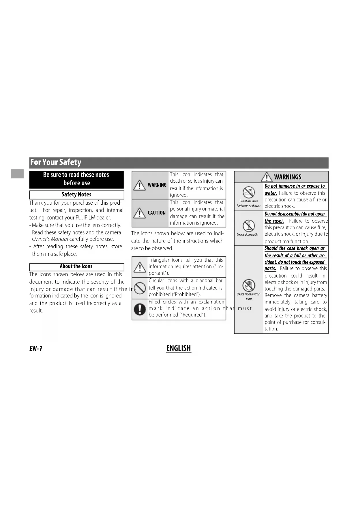 - After reading these safety notes, store them in a safe place. About the Icons The icons shown below are used in this document to indicate the severity of the injury or damage that can result if the in- formation indicated by the icon is ignored and the product is used incorrectly as a result. WARNINGThis icon indicates that death or serious injury can result if the information is ignored.CAUTIONThis icon indicates that personal injury or material damage can result if the information is ignored. The icons shown below are used to indi- cate the nature of the instructions which are to be observed. Triangular icons tell you that this information requires attention (“Im-portant”).Circular icons with a diagonal bar tell you that the action indicated is prohibited (“Prohibited”).Filled circles with an exclamation mark indicate an action that must be performed (“Required”). WARNINGS WARNINGS Do not use in the bathroom or showerDo not immerse in or expose to water. Failure to observe this precaution can cause a fi re or electric shock.Do not disassembleDo not disassemble (do not open the case). Failure to observe this precaution can cause fi re, electric shock, or injury due to product malfunction.Do not touch internal partsShould the case break open as the result of a fall or other ac-cident, do not touch the exposed parts. Failure to observe this precaution could result in electric shock or in injury from touching the damaged parts. Remove the camera battery immediately, taking care to avoid injury or electric shock, and take the product to the point of purchase for consul-tation.EN-2 ENGLISH WARNINGS WARNINGS Do not place on unstable sur- faces. The product may fall, causing injury. Do not view the sun through the lens or camera view nders. Failure to observe this precau- tion can cause permanent visual impairment. CAUTIONS CAUTIONS Do not use or store in locations that are exposed to steam, or smoke or are very humid or extremely dusty. Failure to observe this precaution can cause fi re or electric shock. Do not leave in direct sunlight or in locations subject to very high temperatures, such as in a closed vehicle on a sunny day. Failure to observe this precau- tion can cause fi re. CAUTIONS CAUTIONS Keep out of the reach of small children. This product could cause injury in the hands of a child. Do not handle with wet hands. Failure to observe this precau- tion can cause electric shock. Keep the sun out of the frame when shooting backlit subjects. Sunlight focused into the camera when the sun is in or close to the frame can cause fi r e o r b u r n s . When the product is not in use, replace the lens caps and store out of direct sunlight. Sunlight focused by the lens can cause fi r e o r b u r n s . Do not carry the camera or lens while they are attached to a tripod. The product can fall or strike other objects, caus- ing injury. For Customers in the U. S. A. For Customers in the U. S. A. Tested To Comply With FCC Standards