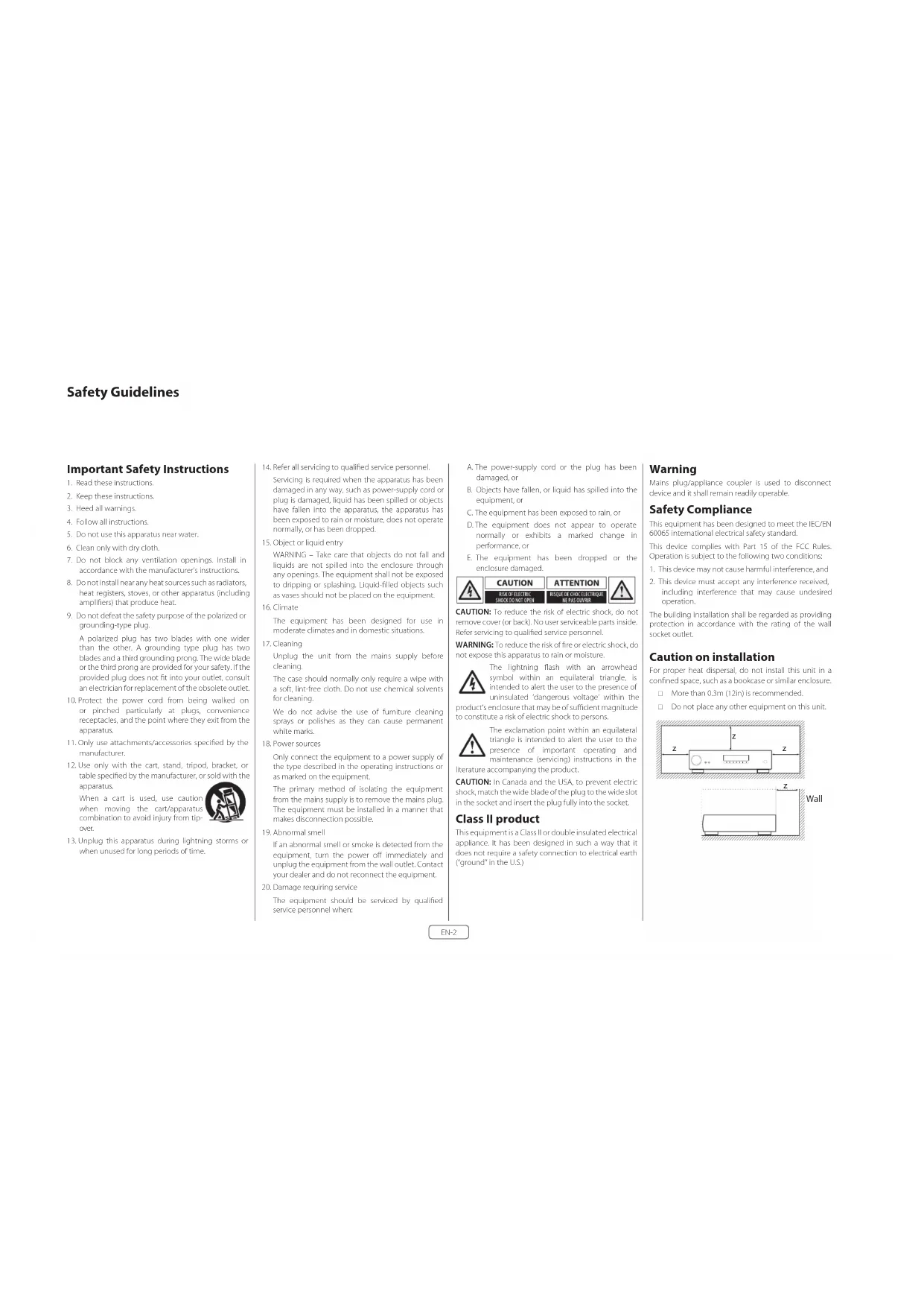 not expose this apparatus to rain or moisture. The lightning flash with an arrowhead symbol within an equilateral triangle, is intended to alert the user to the presence of uninsulated ‘dangerous voltage’ within the product’s enclosure that may be of sufficient magnitude to constitute a risk of electric shock to persons. The exclamation point within an equilateral triangle is intended to alert the user to the presence of important operating and maintenance (servicing) instructions in the literature accompanying the product. CAUTION: In Canada and the USA, to prevent electric shock, match the wide blade of the plug to the wide slot in the socket and insert the plug fully into the socket. Class II product This equipment is a Class II or double insulated electrical appliance. It has been designed in such a way that it does not require a safety connection to electrical earth (“ground” in the U.S.) Warning Mains plug/appliance coupler is used to disconnect device and it shall remain readily operable. Safety Compliance This equipment has been designed to meet the IEC/EN 60065 international electrical safety standard. This device complies with Part 15 of the FCC Rules. Operation is subject to the following two conditions: