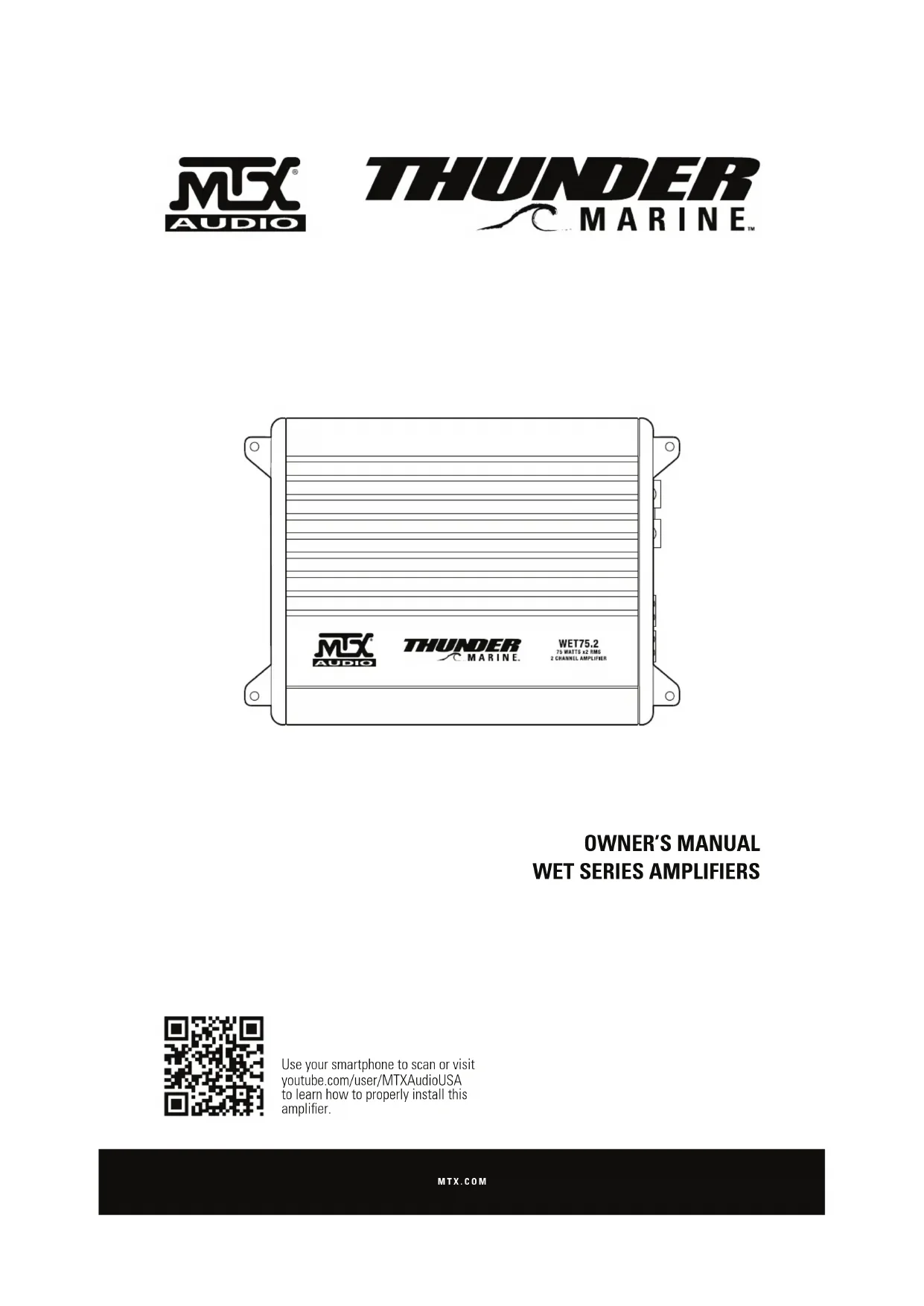 MTX recommends your new Thunder Marine WET Series amplifier be installed by a 12 volt installation specialist. Any deviation from specified installation instructions can cause serious damage to the amplifier, speakers and/or vehicle’s electrical system. Damage caused from improper installation is NOT covered under warranty. Please verify all connections prior to system turn on.