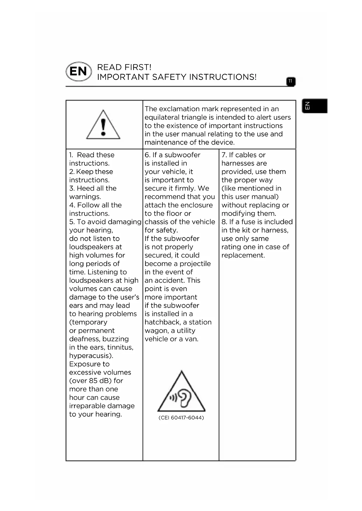 is installed in your vehicle, it is important to secure it firmly. We recommend that you attach the enclosure to the floor or chassis of the vehicle for safety. If the subwoofer is not properly secured, it could become a projectile in the event of an accident. This point is even more important if the subwoofer is installed in a hatchback, a station wagon, a utility vehicle or a van.