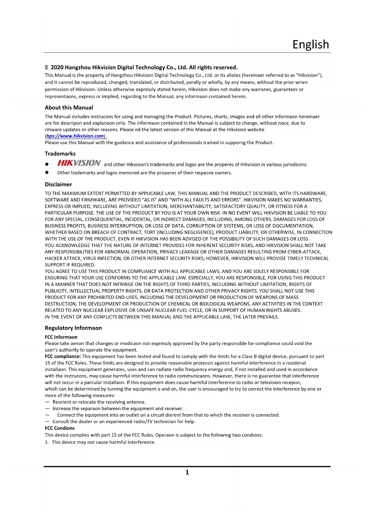 © 2020 Hangzhou Hikvision Digital Technology Co., Ltd. All rights reserved. This Manual is the property of Hangzhou Hikvision Digital Technology Co., Ltd. or its affiliates (hereinafter referred to as "Hikvision"), and it cannot be reproduced, changed, translated, or distributed, partially or wholly, by any means, without the prior written permission of Hikvision. Unless otherwise expressly stated herein, Hikvision does not make any warranties, guarantees or representations, express or implied, regarding to the Manual, any information contained herein. About this Manual The Manual includes instructions for using and managing the Product. Pictures, charts, images and all other information hereinafter are for description and explanation only. The information contained in the Manual is subject to change, without notice, due to firmware updates or other reasons. Please find the latest version of this Manual at the Hikvision website (https://www.hikvision.com). Please use this Manual with the guidance and assistance of professionals trained in supporting the Product. Trademarks and other Hikvision’s trademarks and logos are the properties of Hikvision in various jurisdictions. Other trademarks and logos mentioned are the properties of their respective owners. Disclaimer TO THE MAXIMUM EXTENT PERMITTED BY APPLICABLE LAW, THIS MANUAL AND THE PRODUCT DESCRIBED, WITH ITS HARDWARE, SOFTWARE AND FIRMWARE, ARE PROVIDED “AS IS” AND “WITH ALL FAULTS AND ERRORS”. HIKVISION MAKES NO WARRANTIES, EXPRESS OR IMPLIED, INCLUDING WITHOUT LIMITATION, MERCHANTABILITY, SATISFACTORY QUALITY, OR FITNESS FOR A PARTICULAR PURPOSE. THE USE OF THE PRODUCT BY YOU IS AT YOUR OWN RISK. IN NO EVENT WILL HIKVISION BE LIABLE TO YOU FOR ANY SPECIAL, CONSEQUENTIAL, INCIDENTAL, OR INDIRECT DAMAGES, INCLUDING, AMONG OTHERS, DAMAGES FOR LOSS OF BUSINESS PROFITS, BUSINESS INTERRUPTION, OR LOSS OF DATA, CORRUPTION OF SYSTEMS, OR LOSS OF DOCUMENTATION, WHETHER BASED ON BREACH OF CONTRACT, TORT (INCLUDING NEGLIGENCE), PRODUCT LIABILITY, OR OTHERWISE, IN CONNECTION WITH THE USE OF THE PRODUCT, EVEN IF HIKVISION HAS BEEN ADVISED OF THE POSSIBILITY OF SUCH DAMAGES OR LOSS. YOU ACKNOWLEDGE THAT THE NATURE OF INTERNET PROVIDES FOR INHERENT SECURITY RISKS, AND HIKVISION SHALL NOT TAKE ANY RESPONSIBILITIES FOR ABNORMAL OPERATION, PRIVACY LEAKAGE OR OTHER DAMAGES RESULTING FROM CYBER-ATTACK, HACKER ATTACK, VIRUS INFECTION, OR OTHER INTERNET SECURITY RISKS; HOWEVER, HIKVISION WILL PROVIDE TIMELY TECHNICAL SUPPORT IF REQUIRED. YOU AGREE TO USE THIS PRODUCT IN COMPLIANCE WITH ALL APPLICABLE LAWS, AND YOU ARE SOLELY RESPONSIBLE FOR ENSURING THAT YOUR USE CONFORMS TO THE APPLICABLE LAW. ESPECIALLY, YOU ARE RESPONSIBLE, FOR USING THIS PRODUCT IN A MANNER THAT DOES NOT INFRINGE ON THE RIGHTS OF THIRD PARTIES, INCLUDING WITHOUT LIMITATION, RIGHTS OF PUBLICITY, INTELLECTUAL PROPERTY RIGHTS, OR DATA PROTECTION AND OTHER PRIVACY RIGHTS. YOU SHALL NOT USE THIS PRODUCT FOR ANY PROHIBITED END-USES, INCLUDING THE DEVELOPMENT OR PRODUCTION OF WEAPONS OF MASS DESTRUCTION, THE DEVELOPMENT OR PRODUCTION OF CHEMICAL OR BIOLOGICAL WEAPONS, ANY ACTIVITIES IN THE CONTEXT RELATED TO ANY NUCLEAR EXPLOSIVE OR UNSAFE NUCLEAR FUEL-CYCLE, OR IN SUPPORT OF HUMAN RIGHTS ABUSES. IN THE EVENT OF ANY CONFLICTS BETWEEN THIS MANUAL AND THE APPLICABLE LAW, THE LATER PREVAILS. Regulatory Information FCC Information Please take attention that changes or modification not expressly approved by the party responsible for compliance could void the user’s authority to operate the equipment. FCC compliance: This equipment has been tested and found to comply with the limits for a Class B digital device, pursuant to part 15 of the FCC Rules. These limits are designed to provide reasonable protection against harmful interference in a residential installation. This equipment generates, uses and can radiate radio frequency energy and, if not installed and used in accordance with the instructions, may cause harmful interference to radio communications. However, there is no guarantee that interference will not occur in a particular installation. If this equipment does cause harmful interference to radio or television reception, which can be determined by turning the equipment off and on, the user is encouraged to try to correct the interference by one or more of the following measures: — Reorient or relocate the receiving antenna. — Increase the separation between the equipment and receiver. — Connect the equipment into an outlet on a circuit different from that to which the receiver is connected. — Consult the dealer or an experienced radio/TV technician for help. FCC Conditions This device complies with part 15 of the FCC Rules. Operation is subject to the following two conditions: 1. This device may not cause harmful interference.English