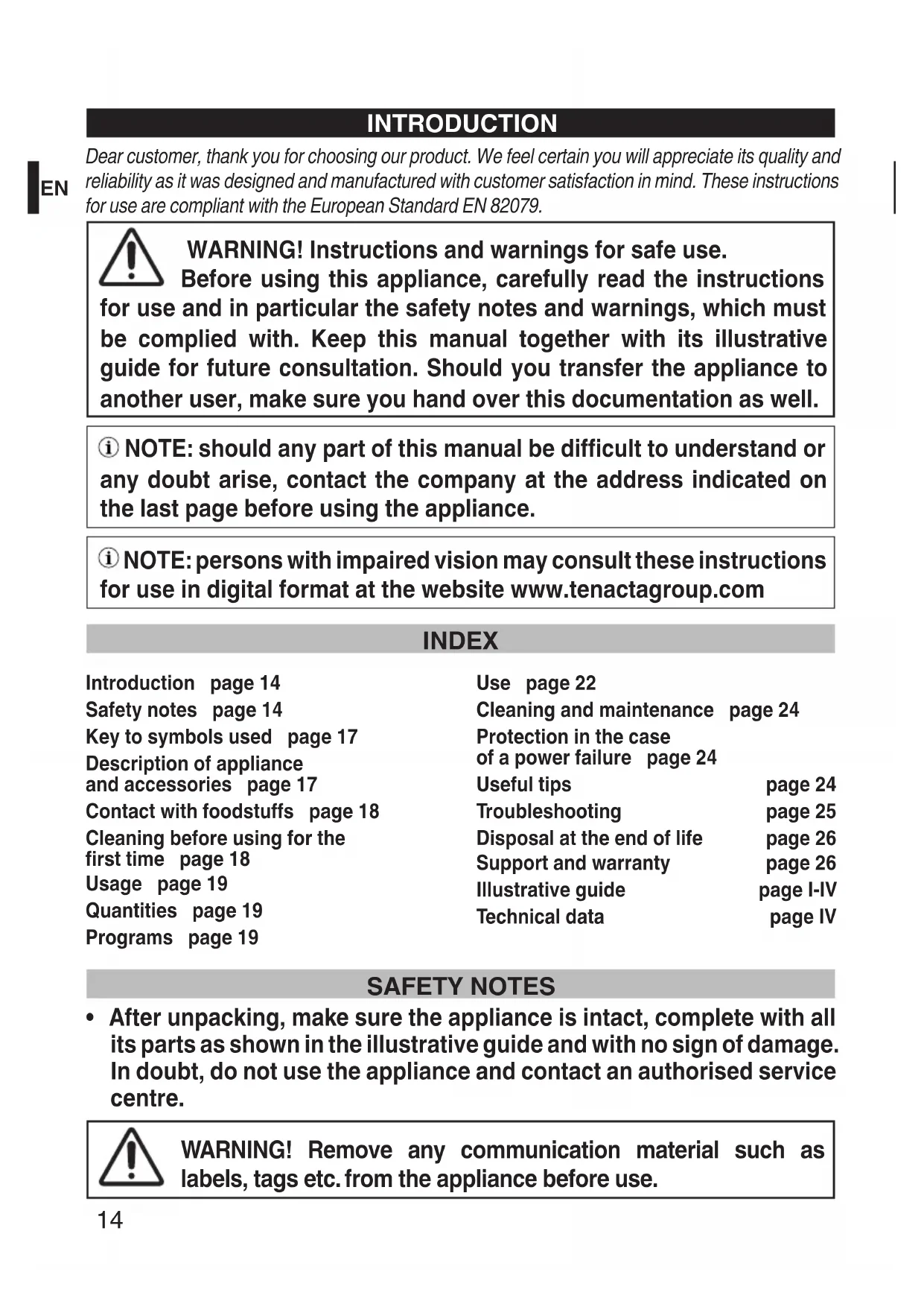 INTRODUCTION Dear customer, thank you for choosing our product. We feel certain you will appreciate its quality and reliability as it was designed and manufactured with customer satisfaction in mind. These instructions for use are compliant with the European Standard EN 82079. WARNING! Instructions and warnings for safe use. Before using this appliance, carefully read the instructions for use and in particular the safety notes and warnings, which must be complied with. Keep this manual together with its illustrative guide for future consultation. Should you transfer the appliance to another user, make sure you hand over this documentation as well. NOTE: should any part of this manual be difficult to understand or any doubt arise, contact the company at the address indicated on the last page before using the appliance. NOTE: persons with impaired vision may consult these instructions for use in digital format at the website www.tenactagroup.com INDEX Introduction page 14 Safety notes page 14 Key to symbols used page 17 Description of appliance and accessories page 17 Contact with foodstuffs page 18 Cleaning before using for the first time page 18 Usage page 19 Quantities page 19 Programs page 19 Use page 22 Cleaning and maintenance page 24 Protection in the case of a power failure page 24 Useful tips page 24 Troubleshooting page 25 Disposal at the end of life page 26 Support and warranty page 26 Illustrative guide page I-IV Technical data page IV SAFETY NOTES