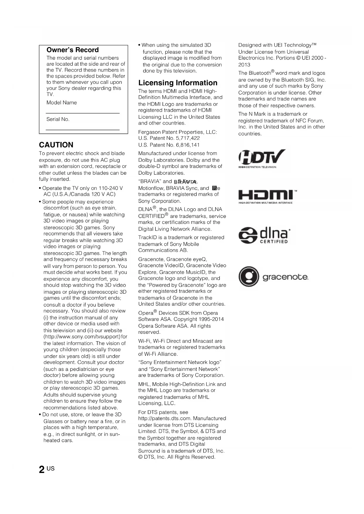 - When using the simulated 3D function, please note that the displayed image is modified from the original due to the conversion done by this television. Licensing Information The terms HDMI and HDMI High- Definition Multimedia Interface, and the HDMI Logo are trademarks or registered trademarks of HDMI Licensing LLC in the United States and other countries. Fergason Patent Properties, LLC: U.S. Patent No. 5,717,422 U.S. Patent No. 6,816,141 Manufactured under license from Dolby Laboratories. Dolby and the double-D symbol are trademarks of Dolby Laboratories. “BRAVIA” and , S-Force, Motionflow, BRAVIA Sync, and are trademarks or registered marks of Sony Corporation. DLNA