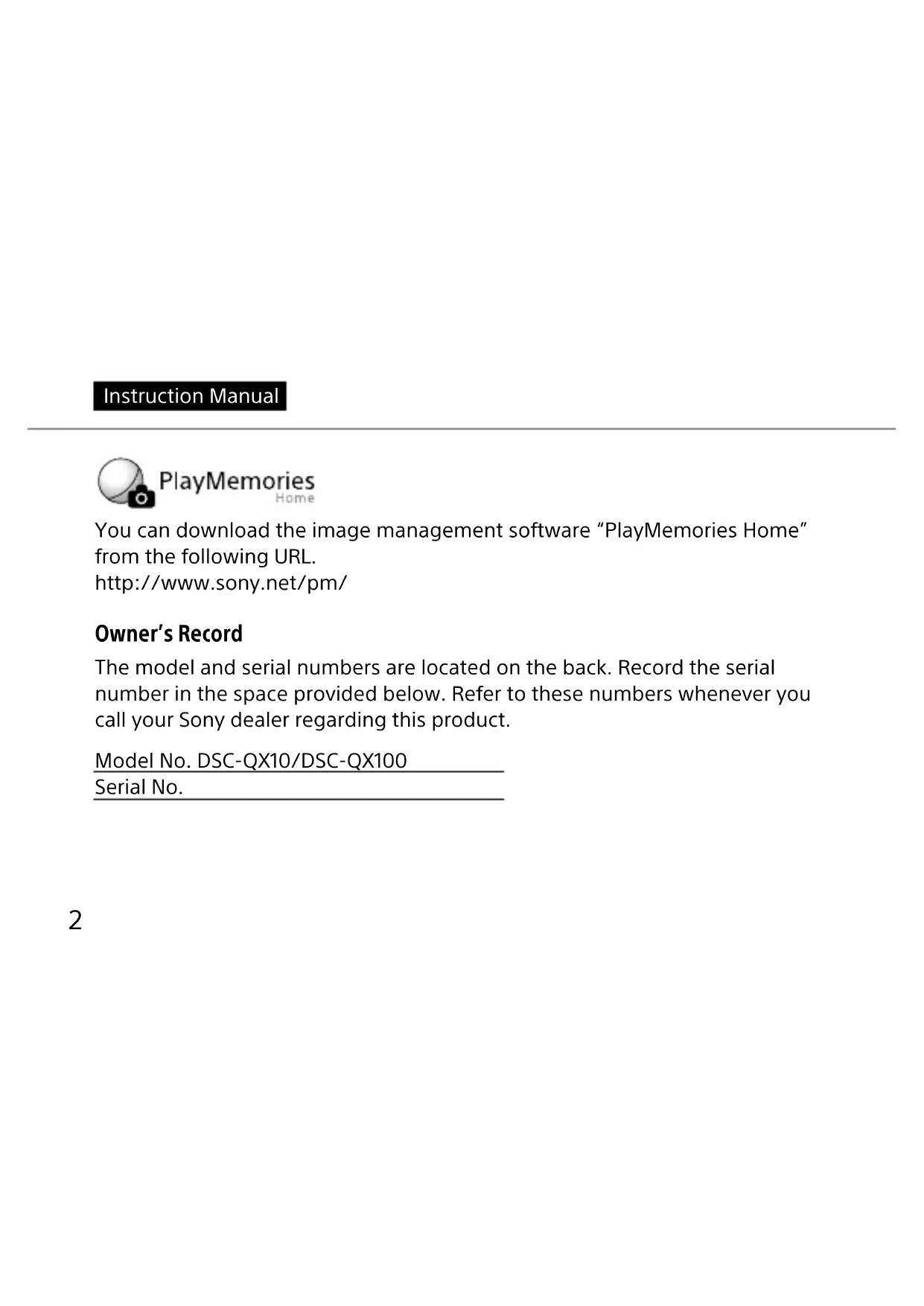 4-480-203-12(1)4-480-203-12(1) ©2013 Sony Corporation Printed in China2 You can download the image management software “PlayMemories Home” from the following URL. http://www.sony.net/pm/ Owner’s Record The model and serial numbers are located on the back. Record the serial number in the space provided below. Refer to these numbers whenever you call your Sony dealer regarding this product. Model No. DSC-QX10/DSC-QX100 Serial No. Instruction ManualGB