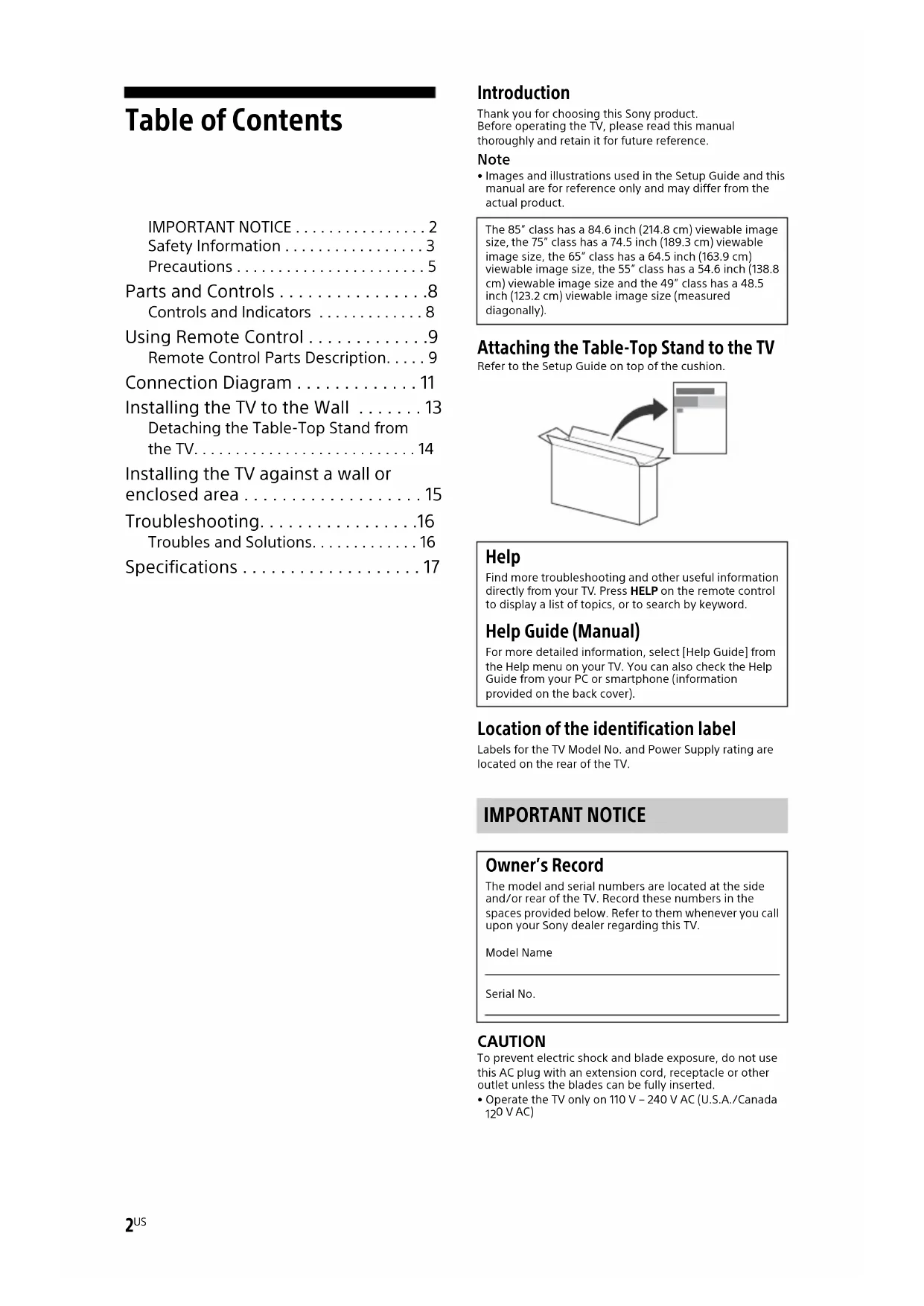 - Images and illustrations used in the Setup Guide and this manual are for reference only and may differ from the actual product. Attaching the Table-Top Stand to the TV Refer to the Setup Guide on top of the cushion. Location of the identification label Labels for the TV Model No. and Power Supply rating are located on the rear of the TV. IMPORTANT NOTICE CAUTION To prevent electric shock and blade exposure, do not use this AC plug with an extension cord, receptacle or other outlet unless the blades can be fully inserted.• Operate the TV only on 110 V – 240 V AC (U.S.A./Canada