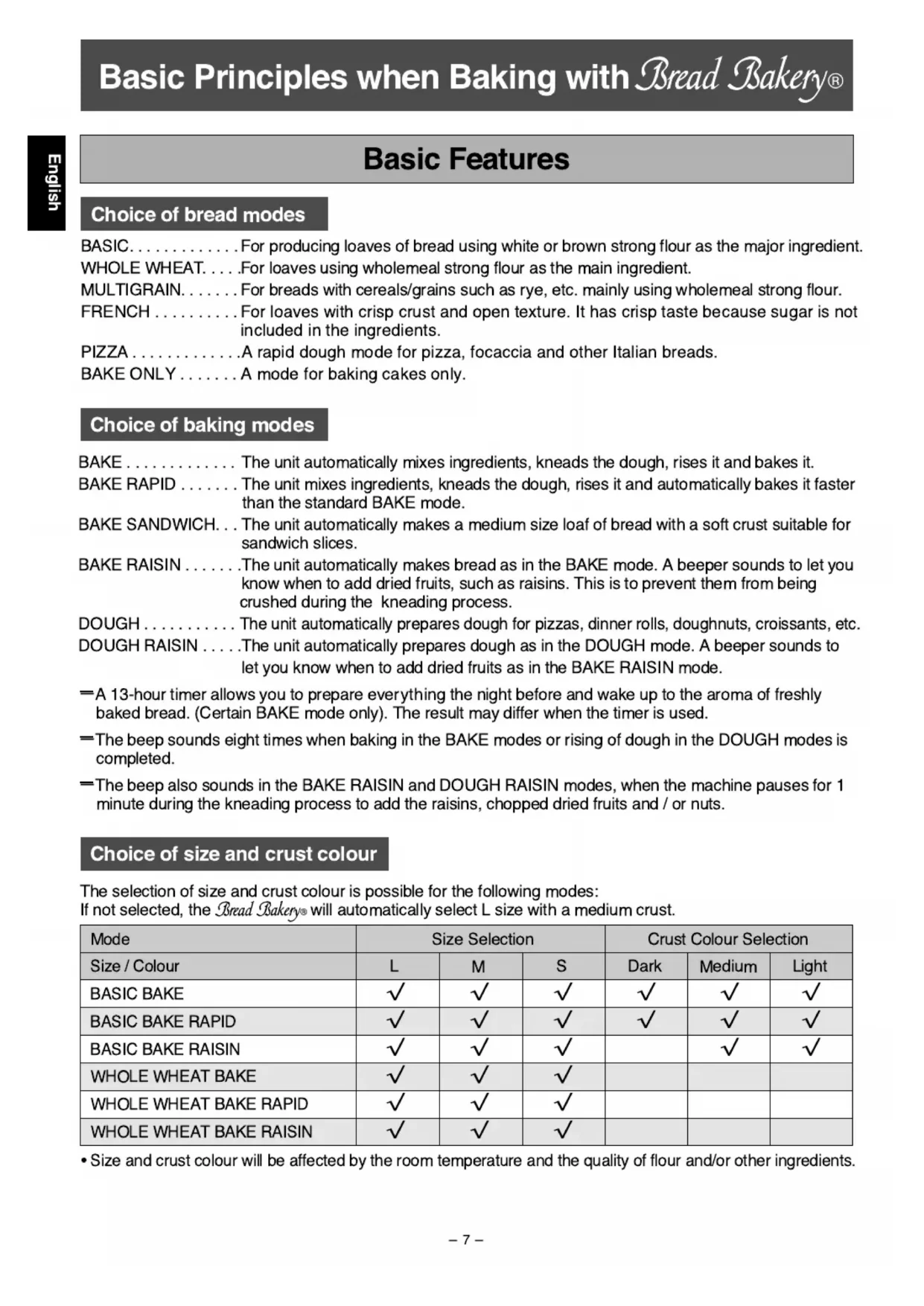 - Mesures à prendre avant d’appeler le service technique –62 DeutschNederlandsFranais EnglishChoice of bread modes BASIC Forproducing loaves of bread using white or brown strong flour as the major ingredient. WHOLE WHEAT Forloaves using wholemeal strong flour as the main ingredient. MULTIGRAIN Forbreads with cereals/grains such as rye, etc. mainly using wholemeal strong flour. FRENCH Forloaves with crisp crust and open texture. It has crisp taste because sugar is not included in the ingredients. PIZZA Arapid dough mode for pizza, focaccia and other Italian breads. BAKE ONLY Amode for baking cakes only. Choice of baking modes Choice of size and crust colour BAKE Theunit automatically mixes ingredients, kneads the dough, rises it and bakes it. BAKE RAPID Theunit mixes ingredients, kneads the dough, rises it and automatically bakes it faster than the standard BAKE mode. BAKE SANDWICH The unit automatically makes a medium size loaf of bread with a soft crust suitable for sandwich slices. BAKE RAISIN The unit automatically makes bread as in the BAKE mode. A beeper sounds to let you know when to add dried fruits, such as raisins. This is to prevent them from being crushed during the kneading process. DOUGH The unit automatically prepares dough for pizzas, dinner rolls, doughnuts, croissants, etc. DOUGH RAISIN Theunit automatically prepares dough as in the DOUGH mode. A beeper sounds to let you know when to add dried fruits as in the BAKE RAISIN mode. p. 61