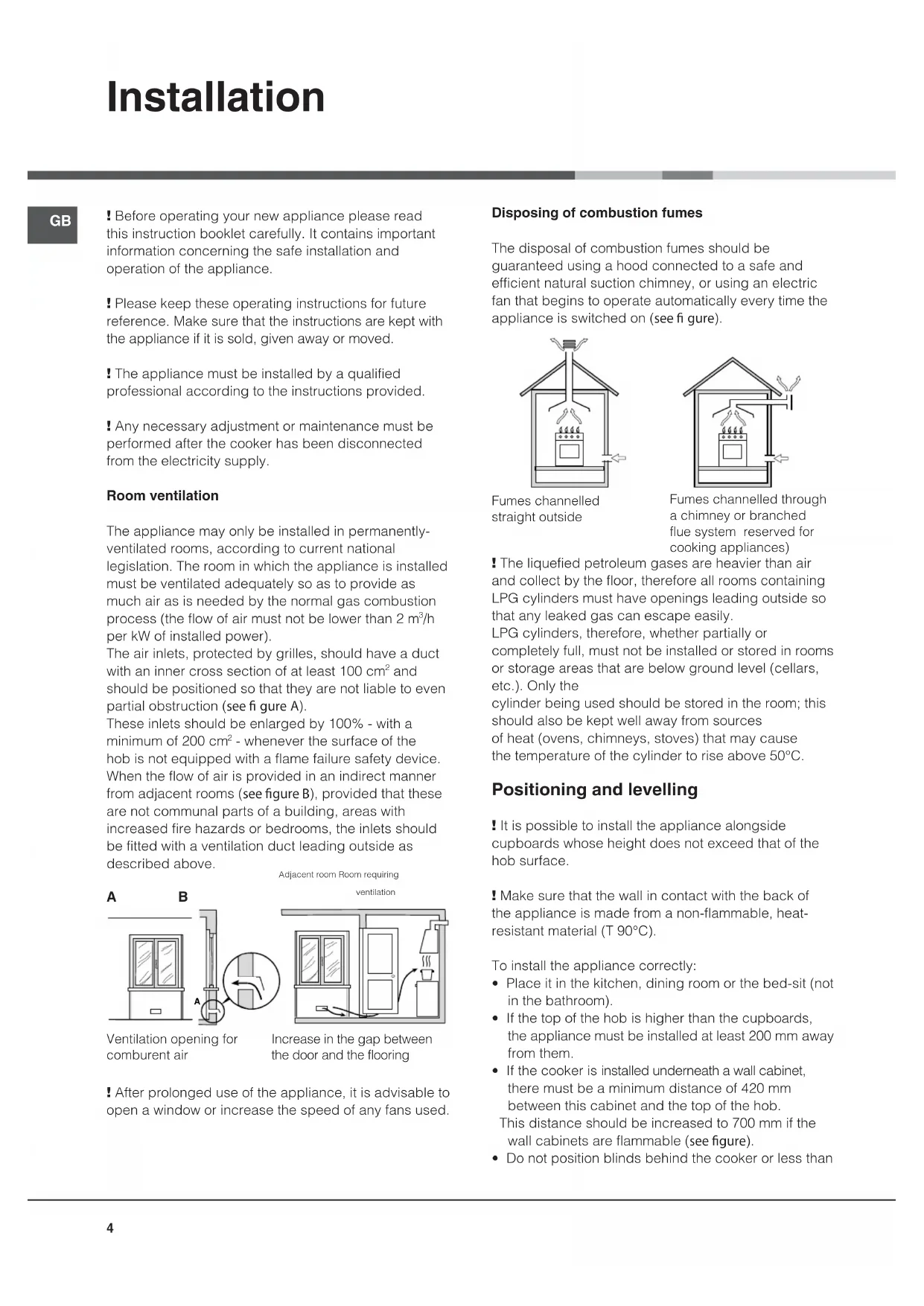 - whenever the surface of the hob is not equipped with a flame failure safety device. When the flow of air is provided in an indirect manner from adjacent rooms (see gure B), provided that these are not communal parts of a building, areas with increased fire hazards or bedrooms, the inlets should be fitted with a ventilation duct leading outside as described above. A B ! After prolonged use of the appliance, it is advisable to open a window or increase the speed of any fans used. Disposing of combustion fumes The disposal of combustion fumes should be guaranteed using a hood connected to a safe and efficient natural suction chimney, or using an electric fan that begins to operate automatically every time the appliance is switched on (see gure). ! The liquefied petroleum gases are heavier than air and collect by the floor, therefore all rooms containing LPG cylinders must have openings leading outside so that any leaked gas can escape easily. LPG cylinders, therefore, whether partially or completely full, must not be installed or stored in rooms or storage areas that are below ground level (cellars, etc.). Only the cylinder being used should be stored in the room; this should also be kept well away from sources of heat (ovens, chimneys, stoves) that may cause the temperature of the cylinder to rise above 50°C. Positioning and levelling ! It is possible to install the appliance alongside cupboards whose height does not exceed that of the hob surface. ! Make sure that the wall in contact with the back of the appliance is made from a non-flammable, heat- resistant material (T 90°C). To install the appliance correctly: