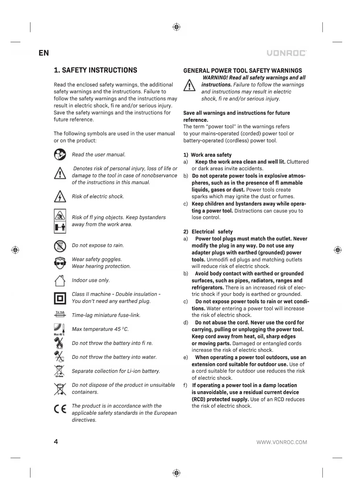 Do not open the battery. Danger of shortcircuiting. b) Protect the battery against heat, e. g., against continuous intense sunlight, fi re, water, and moisture. Danger of explosion. c) In case of damage and improper use of the bat- tery, vapours may be emitted. Ventilate the area and seek medical help in case of complaints. The vapours can irritate the respiratory system. d) Use the battery only in conjunction with your Vonroc product. This measure alone protects the battery against dangerous overload.