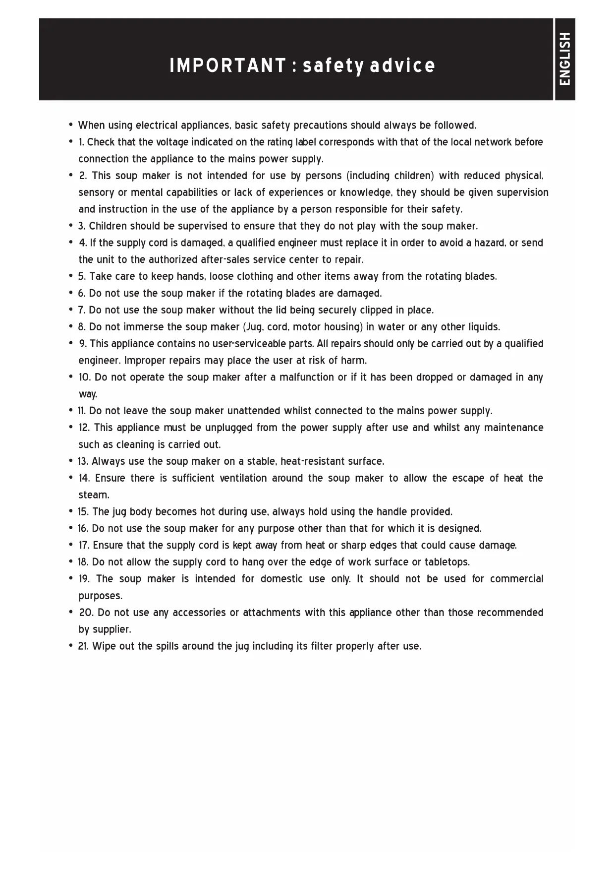 - 19. The soup maker is intended for domestic use only. It should not be used for commercial purposes.