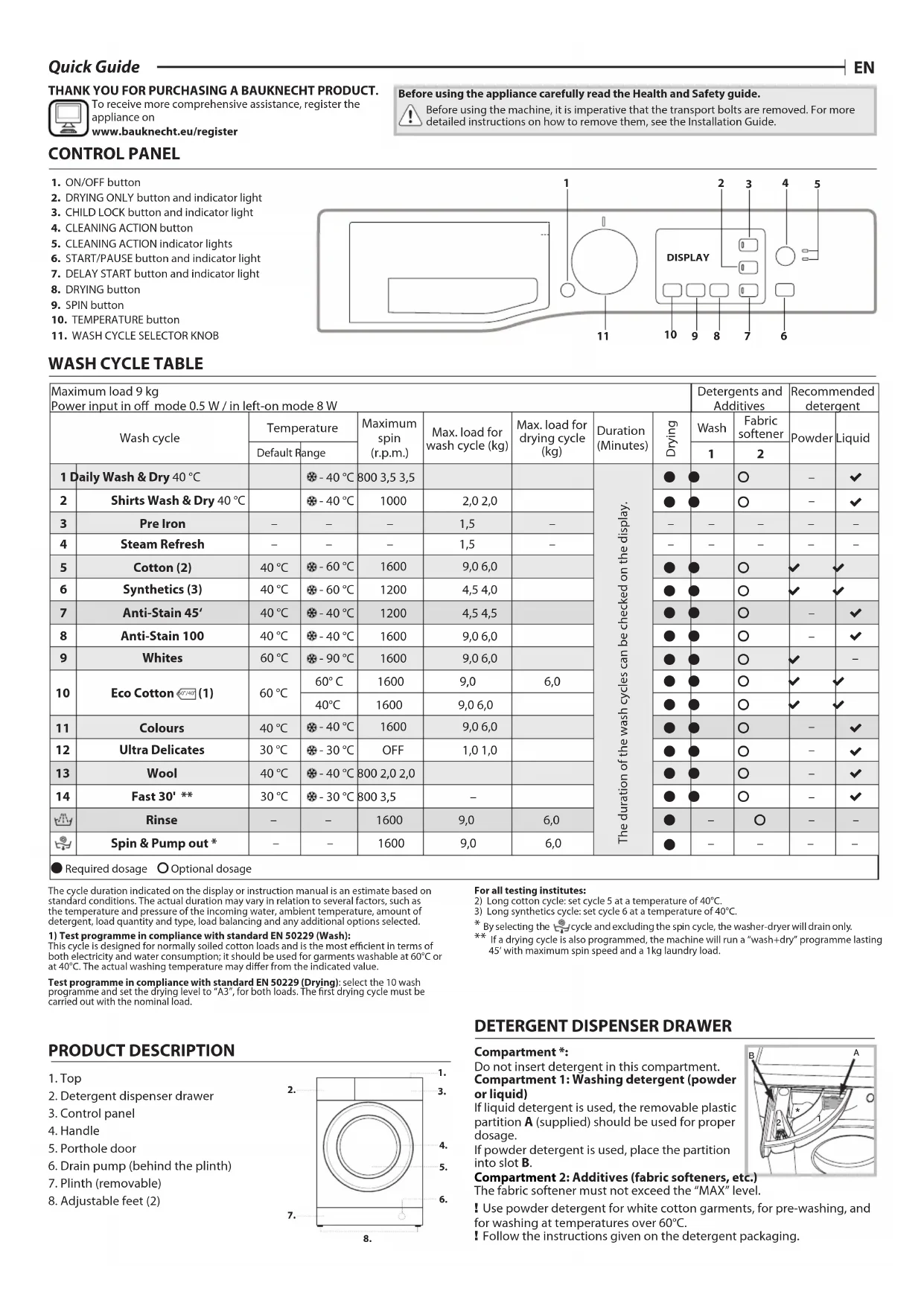 - Alternatively, contact our Technical Assistance Service (the telephone number is indicated in the warranty booklet). When contacting the Technical Assistance Service, provide the codes shown on the adhesive label applied to the inside of the door. xxxxxxxxxxxx xxxx DEMO MODE: to deactivate this function, switch the washer-dryer OFF. Than press and hold “Start/Pause” button, within 5 seconds press also “ON/OFF” button and hold both buttons for 2 seconds.FR Guide rapide MERCI D’AVOIR ACHETÉ UN PRODUIT BAUKNECHT. Pour bénécier d’une assistance plus complète, enregistrer l’appareil sur www.bauknecht.eu/register