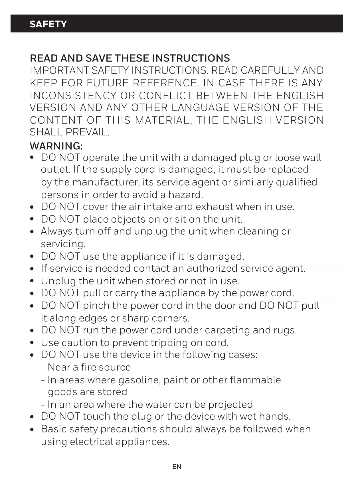 DO NOT operate the unit with a damaged plug or loose wall outlet. If the supply cord is damaged, it must be replaced by the manufacturer, its service agent or similarly qualified persons in order to avoid a hazard. DO NOT cover the air intake and exhaust when in use. DO NOT place objects on or sit on the unit. Always turn off and unplug the unit when cleaning or servicing. DO NOT use the appliance if it is damaged. If service is needed contact an authorized service agent. Unplug the unit when stored or not in use. DO NOT pull or carry the appliance by the power cord. DO NOT pinch the power cord in the door and DO NOT pull it along edges or sharp corners. DO NOT run the power cord under carpeting and rugs. Use caution to prevent tripping on cord. DO NOT use the device in the following cases: - Near a fire source - In areas where gasoline, paint or other flammable goods are stored - In an area where the water can be projected DO NOT touch the plug or the device with wet hands. Basic safety precautions should always be followed when using electrical appliances. SAFETY