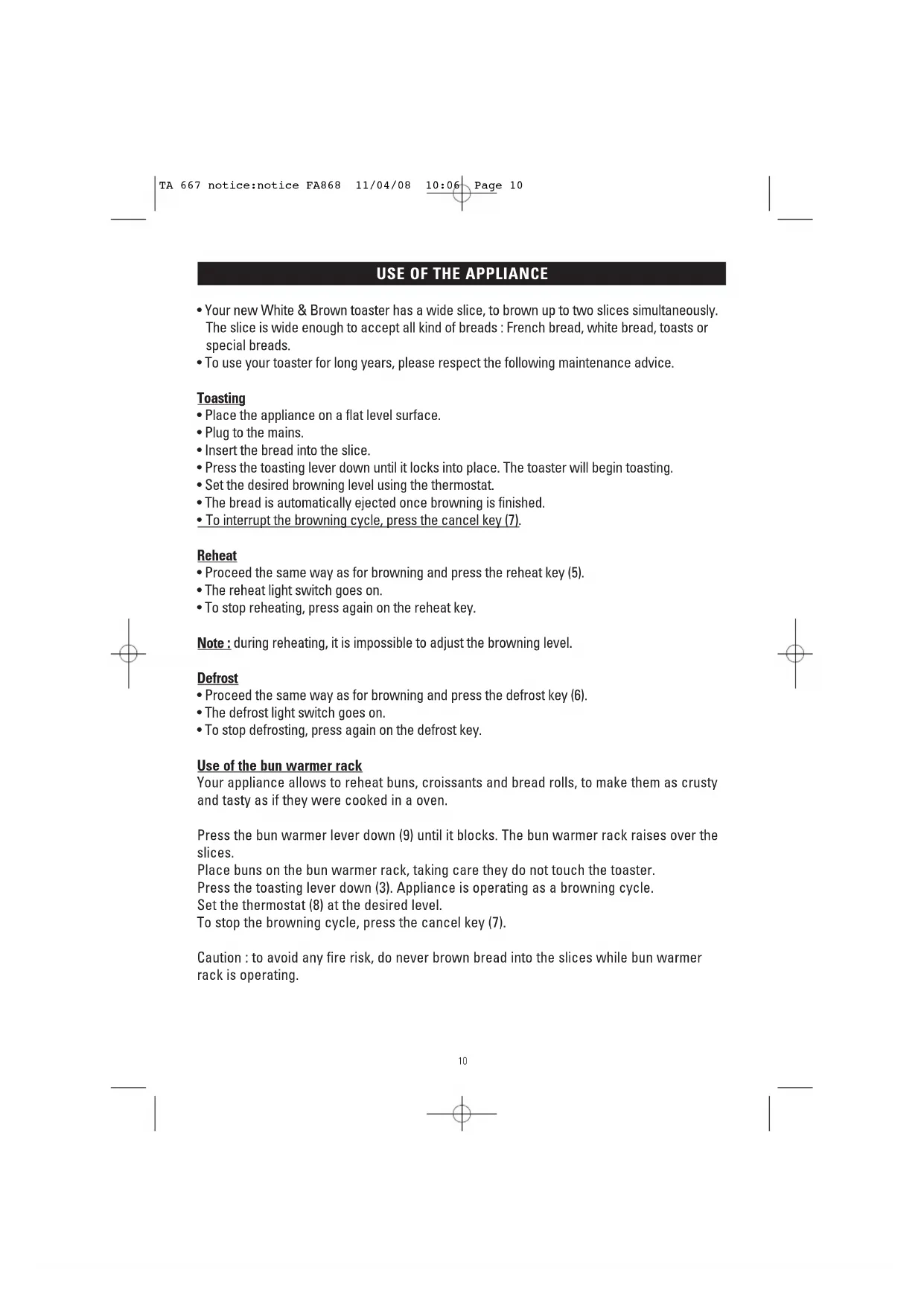 - To stop defrosting, press again on the defrost key. Use of the bun warmer rack Your appliance allows to reheat buns, croissants and bread rolls, to make them as crusty and tasty as if they were cooked in a oven. Press the bun warmer lever down (9) until it blocks. The bun warmer rack raises over the slices. Place buns on the bun warmer rack, taking care they do not touch the toaster. Press the toasting lever down (3). Appliance is operating as a browning cycle. Set the thermostat (8) at the desired level. To stop the browning cycle, press the cancel key (7). Caution : to avoid any fire risk, do never brown bread into the slices while bun warmer rack is operating.