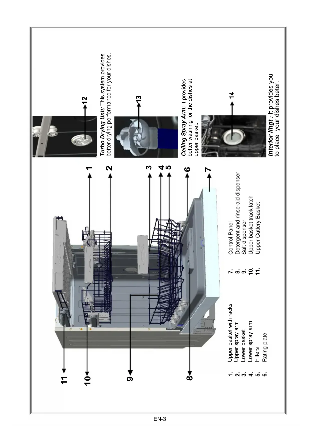Ceiling Spray Arm: It provides better washing for the dishes at upper basket. 13 Rating plate Detergent and rinse-aid dispenser Salt dispenser Upper basket track latch Upper Cutlery Basket