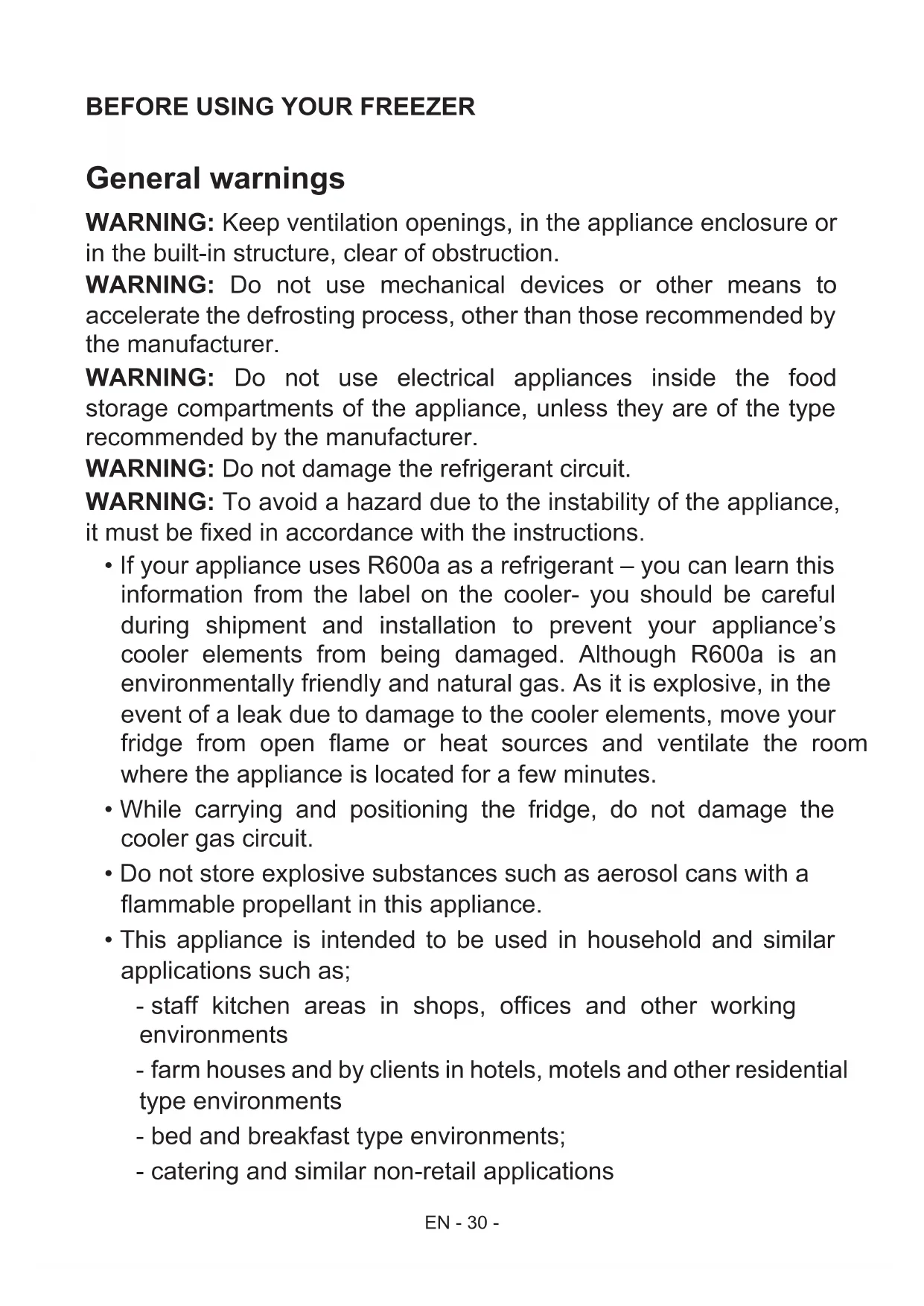 - If your appliance uses R600a as a refrigerant – you can learn this information from the label on the cooler- you should be careful during shipment and installation to prevent your appliance’s cooler elements from being damaged. Although R600a is an environmentally friendly and natural gas. As it is explosive, in the event of a leak due to damage to the cooler elements, move your fridge from open ame or heat sources and ventilate the room where the appliance is located for a few minutes.
