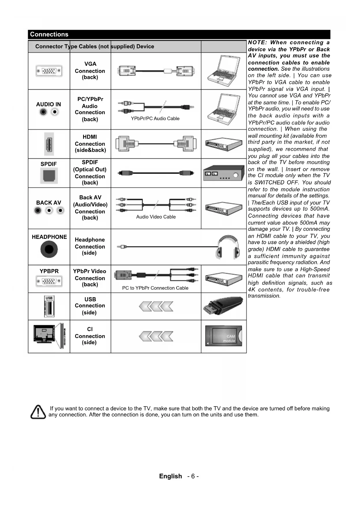 Connection (side) CAM module NOTE: When connecting a device via the YPbPr or Back AV inputs, you must use the connection cables to enable connection. See the illustrations on the left side. | You can use YPbPr to VGA cable to enable YPbPr signal via VGA input. | You cannot use VGA and YPbPr at the same time. | To enable PC/ YPbPr audio, you will need to use the back audio inputs with a YPbPr/PC audio cable for audio connection. | When using the wall mounting kit (available from third party in the market, if not supplied), we recommend that you plug all your cables into the back of the TV before mounting on the wall. | Insert or remove the CI module only when the TV is SWITCHED OFF. You should refer to the module instruction manual for details of the settings. | The/Each USB input of your TV supports devices up to 500mA. Connecting devices that have current value above 500mA may damage your TV. | By connecting an HDMI cable to your TV, you have to use only a shielded (high grade) HDMI cable to guarantee a sufficient immunity against parasitic frequency radiation. And make sure to use a High-Speed HDMI cable that can transmit high denition signals, such as 4K contents, for trouble-free transmission. IfyouwanttoconnectadevicetotheTV,makesurethatboththeTVandthedeviceareturnedobeforemaking any connection. After the connection is done, you can turn on the units and use them.English - 7 - Switching On/O To Switch the TV On Connect the power cord to a power source such as a wallsocket(220-240VAC,50Hz). To switch on the TV from standby mode either:
