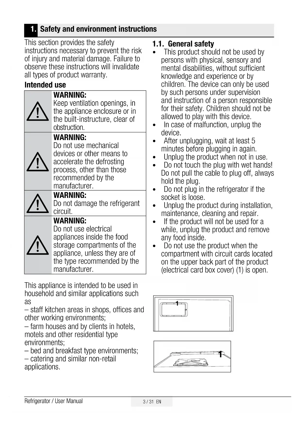 – staff kitchen areas in shops, offices and other working environments; – farm houses and by clients in hotels, motels and other residential type environments; – bed and breakfast type environments; – catering and similar non-retail applications. 1.1. General safety t This product should not be used by persons with physical, sensory and mental disabilities, without sufficient knowledge and experience or by children. The device can only be used by such persons under supervision and instruction of a person responsible for their safety. Children should not be allowed to play with this device. t In case of malfunction, unplug the device. t After unplugging, wait at least 5 minutes before plugging in again. t Unplug the product when not in use. t Do not touch the plug with wet hands! Do not pull the cable to plug off, always hold the plug. t Do not plug in the refrigerator if the socket is loose. t Unplug the product during installation, maintenance, cleaning and repair. t If the product will not be used for a while, unplug the product and remove any food inside. t Do not use the product when the compartment with circuit cards located on the upper back part of the product (electrical card box cover) (1) is open.
