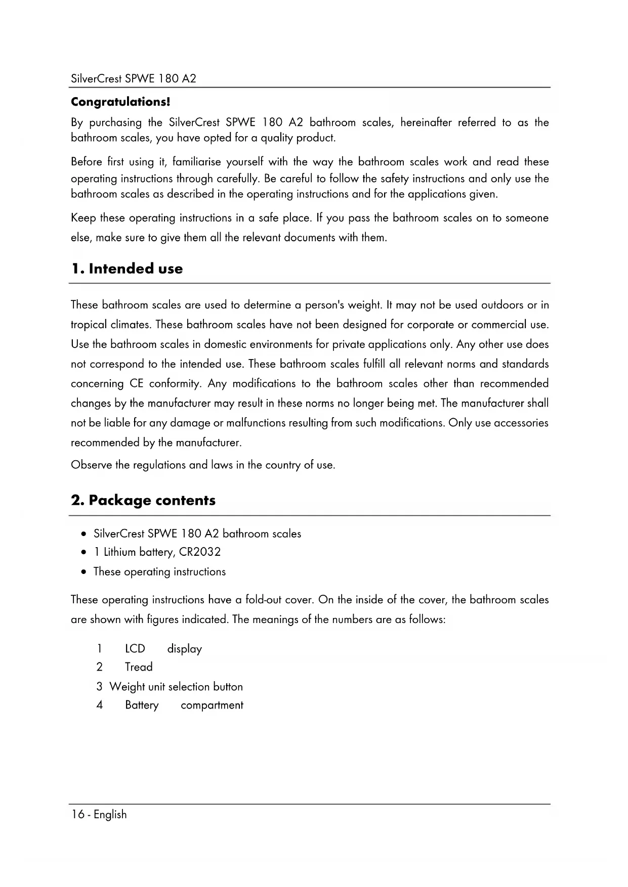 - These operating instructions These operating instructions have a fold-out cover. On the inside of the cover, the bathroom scales are shown with figures indicated. The meanings of the numbers are as follows: 1 LCD display 2 Tread 3 Weight unit selection button 4 Battery compartmentSilverCrest SPWE 180 A2 English - 17