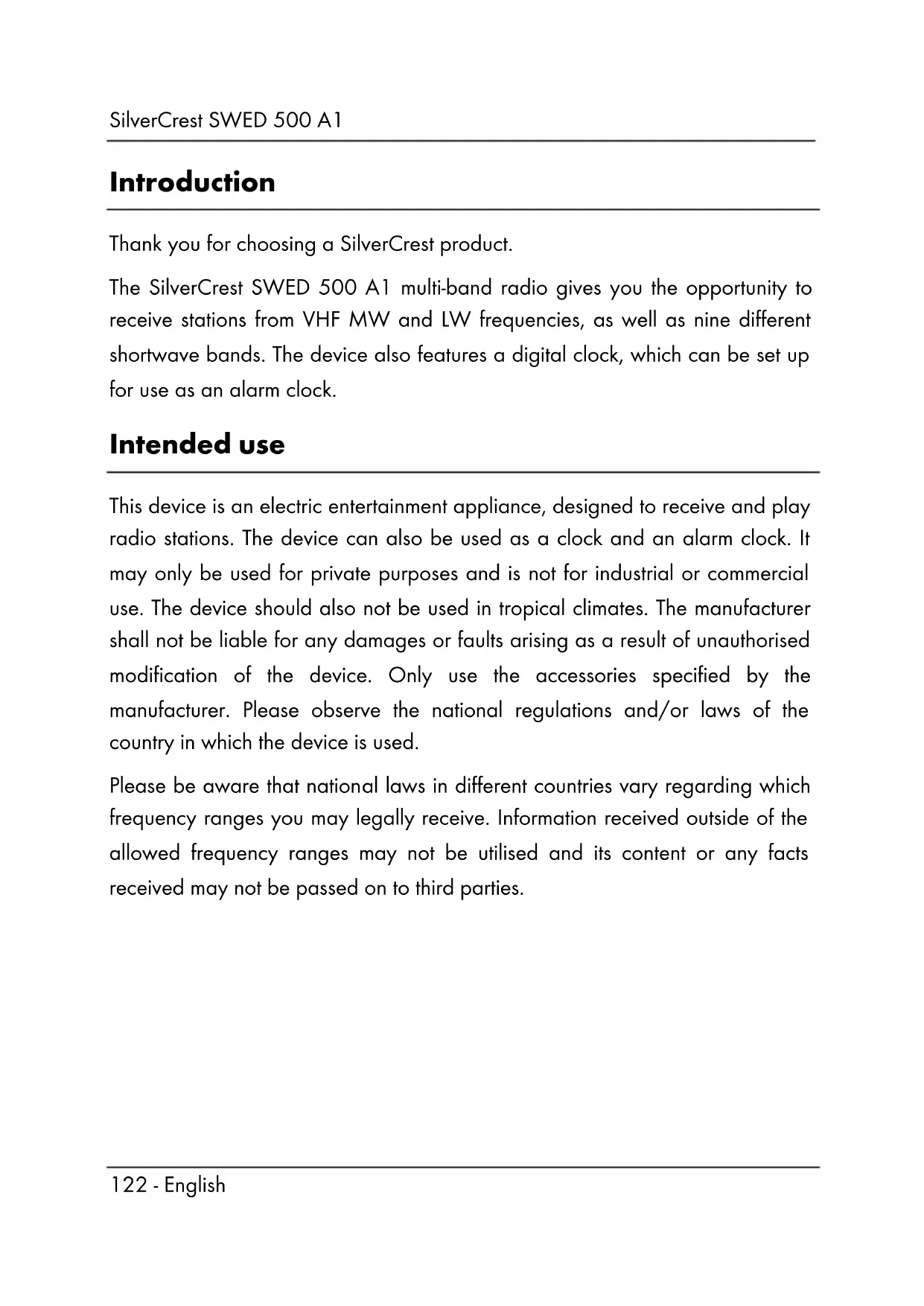 Introduction Thank you for choosing a SilverCrest product. The SilverCrest SWED 500 A1 multi-band radio gives you the opportunity to receive stations from VHF MW and LW frequencies, as well as nine different shortwave bands. The device also features a digital clock, which can be set up for use as an alarm clock. Intended use This device is an electric entertainment appliance, designed to receive and play radio stations. The device can also be used as a clock and an alarm clock. It may only be used for private purposes and is not for industrial or commercial use. The device should also not be used in tropical climates. The manufacturer shall not be liable for any damages or faults arising as a result of unauthorised modification of the device. Only use the accessories specified by the manufacturer. Please observe the national regulations and/or laws of the country in which the device is used. Please be aware that national laws in different countries vary regarding which frequency ranges you may legally receive. Information received outside of the allowed frequency ranges may not be utilised and its content or any facts received may not be passed on to third parties.SilverCrest SWED 500 A1 English - 123 Package contents Unpack the device and all accessories. Remove all packaging materials and check all parts for completeness and for signs of damage. If any parts are missing or damaged, please contact the manufacturer. A Multi-band radio SWED 500 A1 B Mains adapter C Case D SWED 500 A1 earphones E These instructions (symbol icon)SilverCrest SWED 500 A1